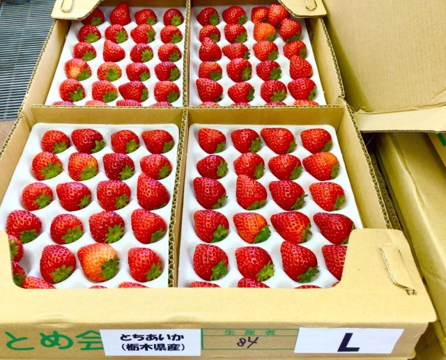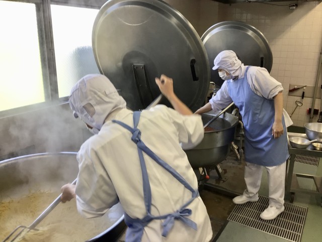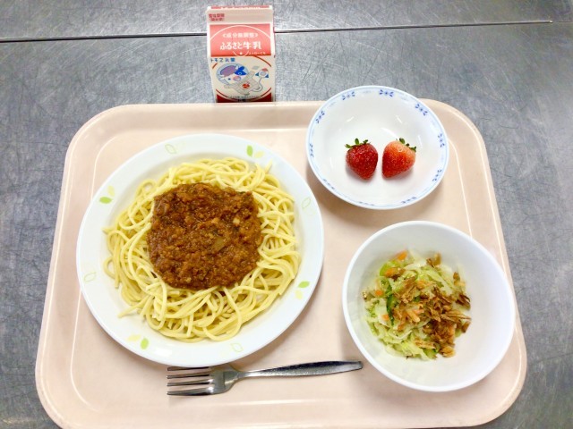 給食のミートソースは、豚ひき肉のほかに刻んだ大豆ととりレバーを加えて栄養価をアップさせています。玉ねぎ、にんじん、セロリなど野菜もたっぷり入っています。野菜はじっくり炒めて甘さを引き出しています。サラダには、ごぼうを油で揚げたごぼうチップを入れています。香ばしくてとても美味しいサラダです。いちごは栃木産のとちあいかです。
