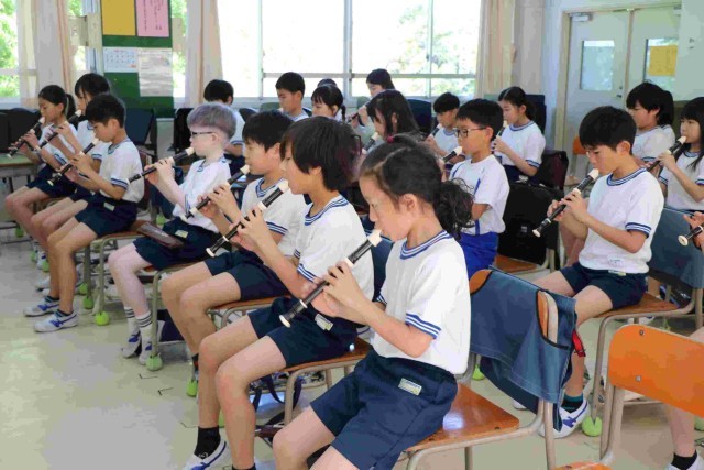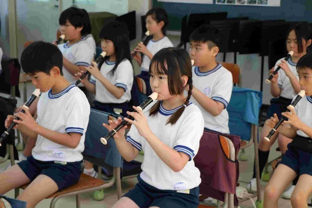 新しい音楽の先生に石井戸囃子のリコーダーを披露しました。みんなよく覚えています。姿勢も完璧に整えていて、「音楽の教科書に載せられるくらい、いい姿勢」と伝えると、喜びつつも「体育着でリコーダーだと載らないかな」との返事。まんざらでもないようです。今年の音楽はまだまだあります。また違う日にも見に行きますね。