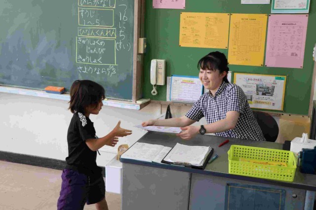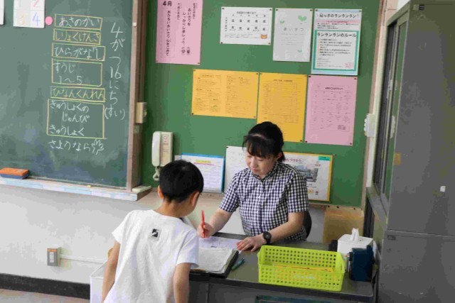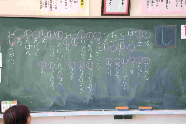 「し」がつく言葉をたくさん発表し合えたようです。丁寧に書いた後は先生に見せます。ほめてもらえる字が書けたかな?見せに行くと、嬉しそうな子、ドキドキしている子など様々です。