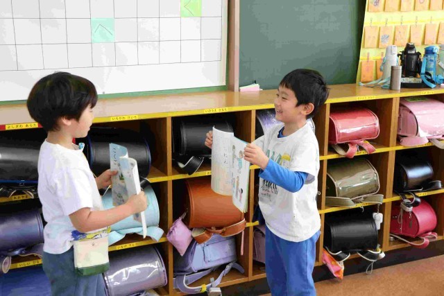 自分の名前を丁寧に書いて、友達と見せ合いながら、「わたしの名前は○○です。よろしくおねがいします。」と言う練習をしました。友達とやるのはやっぱり楽しいようです。