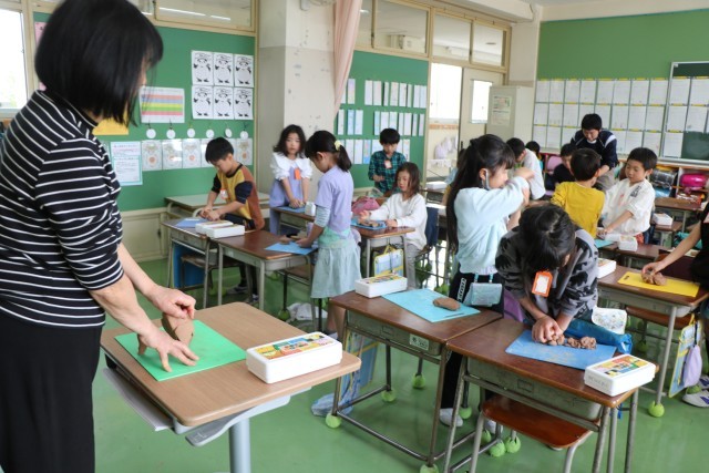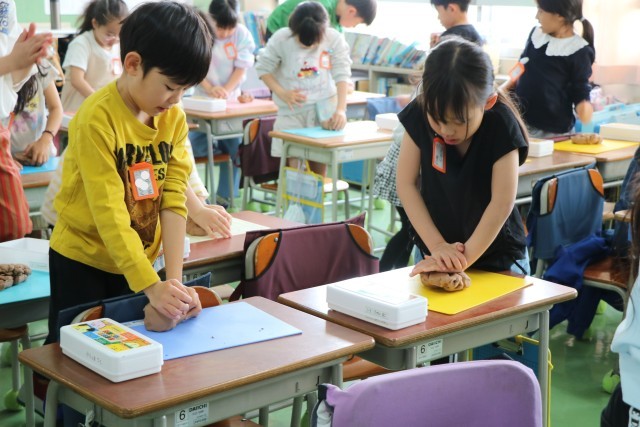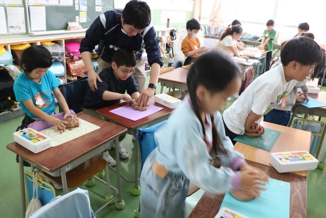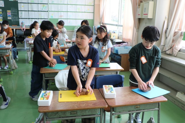 2年生図工の様子です。体を使って粘土と格闘しています。
