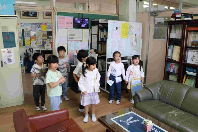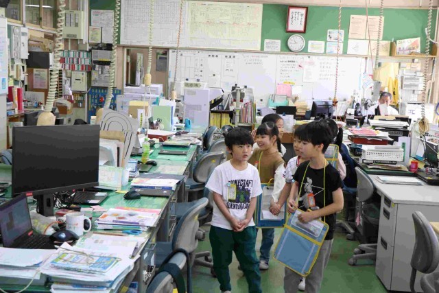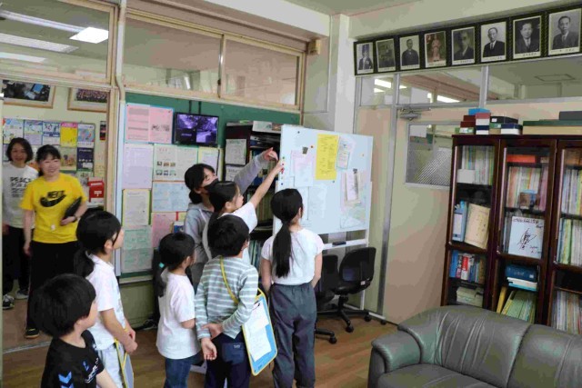 運よく校長室や職員室に入らせてもらえたグループもありました。ちょうど休み時間だった6年生のお兄さん・お姉さんが、歴代の校長先生の写真が飾られていることなどを教えてくれました。