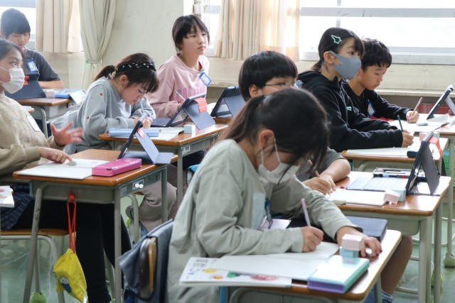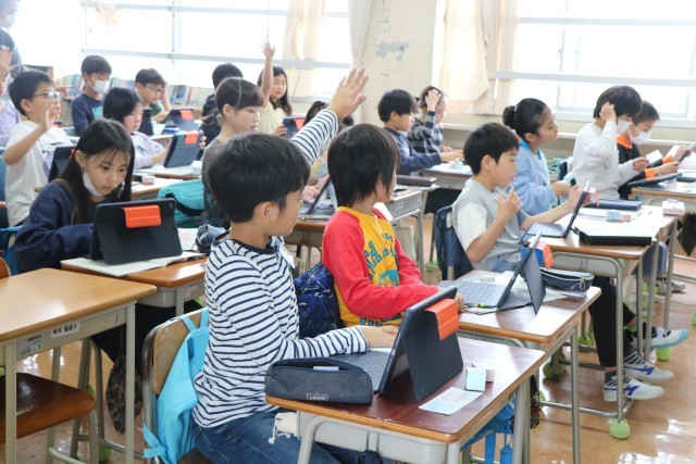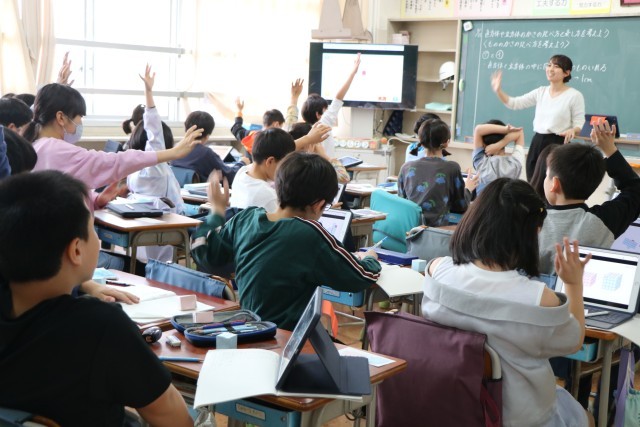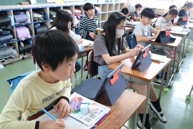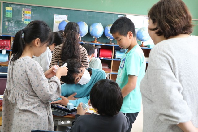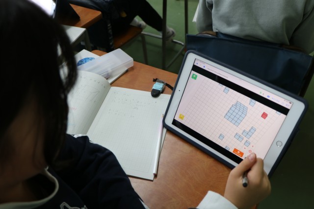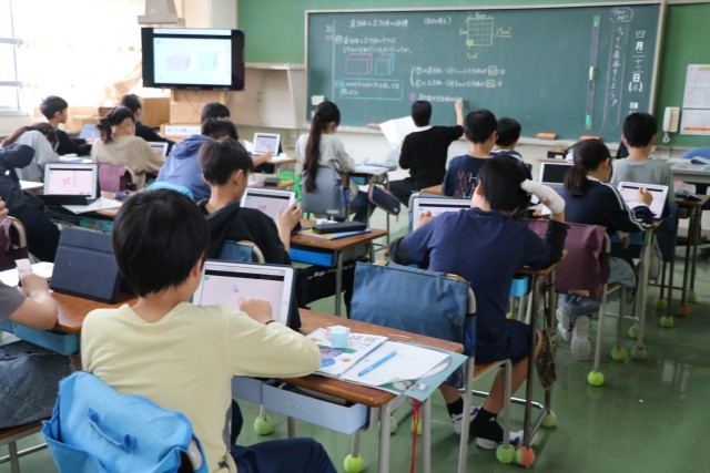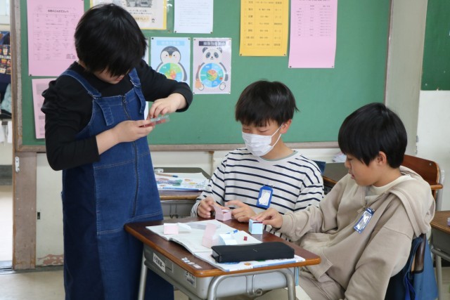 5年生算数「直方体と立方体の体積」の学習の様子です。1辺が1センチメートルの立方体を使って考えたり、タブレットを使って考えたり、具体物で試行を深めています。