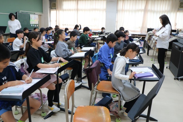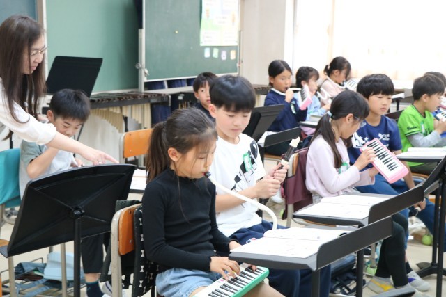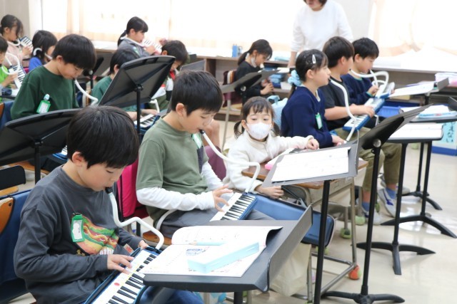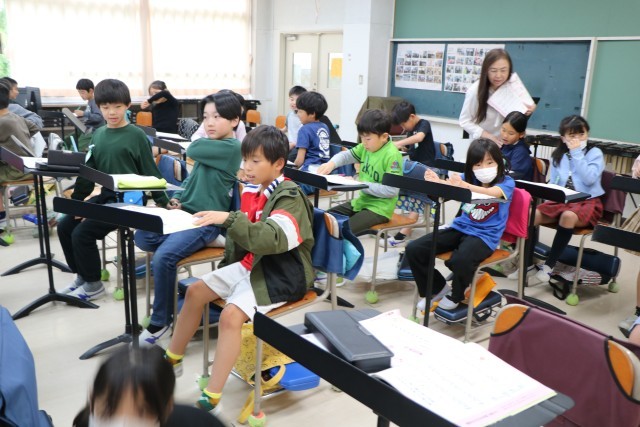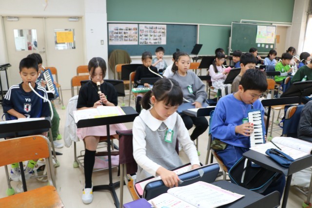 4年生音楽の様子です。「いいことありそう」の曲の楽譜を読みどのようなリズムか、いくつ伸ばす音符かみんなで確認してから、楽器で演奏します。