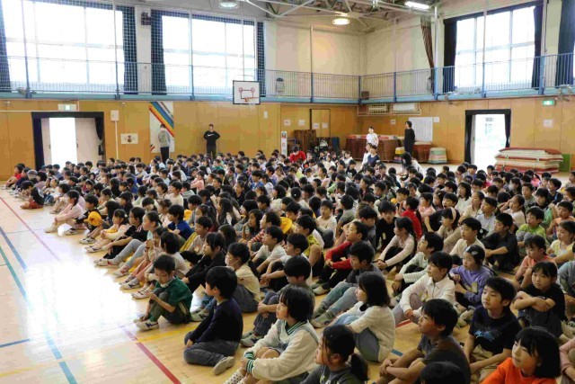 今日の集会は5・6年生が体育館の前にいて、1~4年生が後ろにいる、いつもと違う集合です。しかも5・6年生が後ろを向いて、1~4年生と向かい合っています。