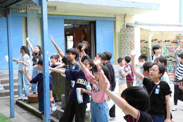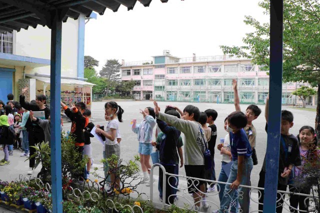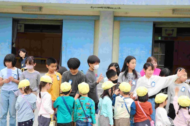 幼稚園・保育園のみんなが帰る時間です。体育館でさようならではなく、外までお見送りに行っていつまでも「バイバイ、またね」と手を振る様子は、今年に限らず恒例の姿です。