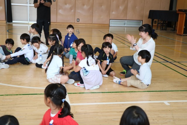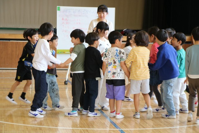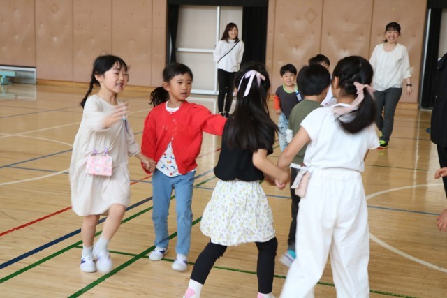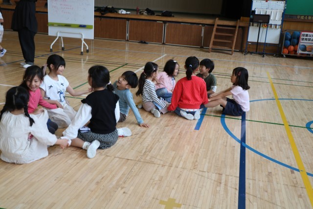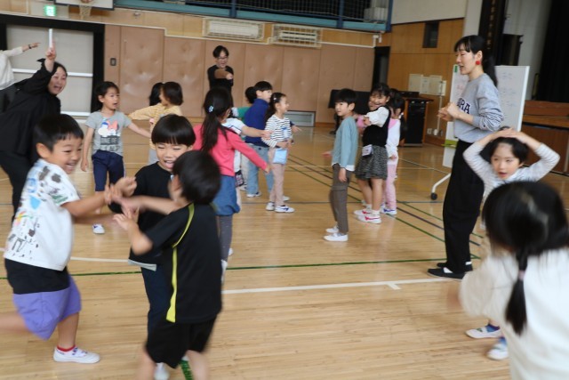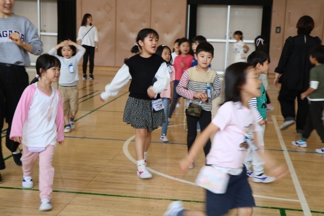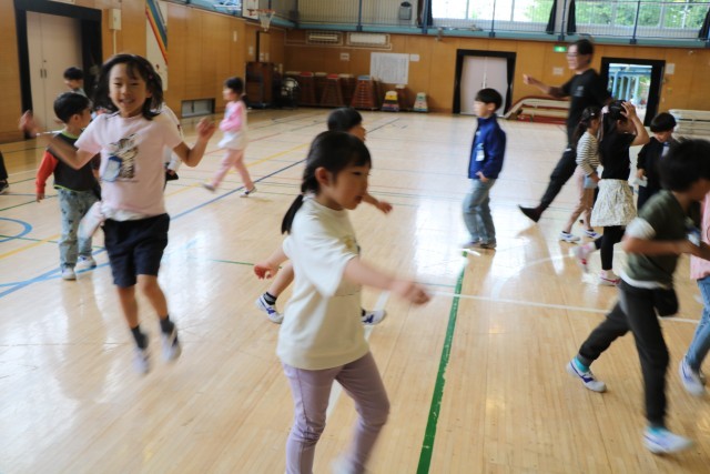 「たいいくかん」・・・とだんだん難しくなります。子どもたちは少しづつ周りを見ながら、いっしょになったり、あそこがまだグループできていないよ!と教え合ったりして楽しみます。子どもたちの力は素晴らしいです!