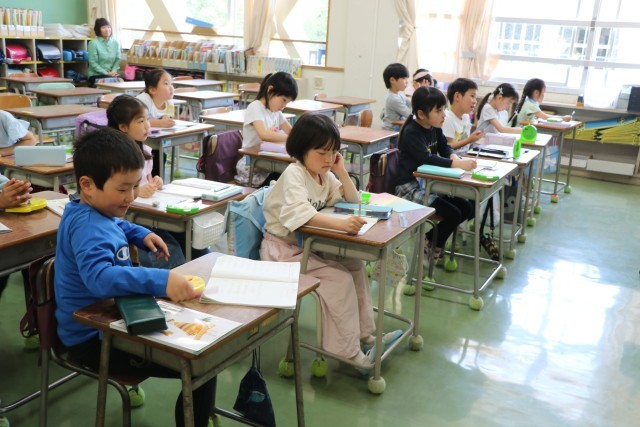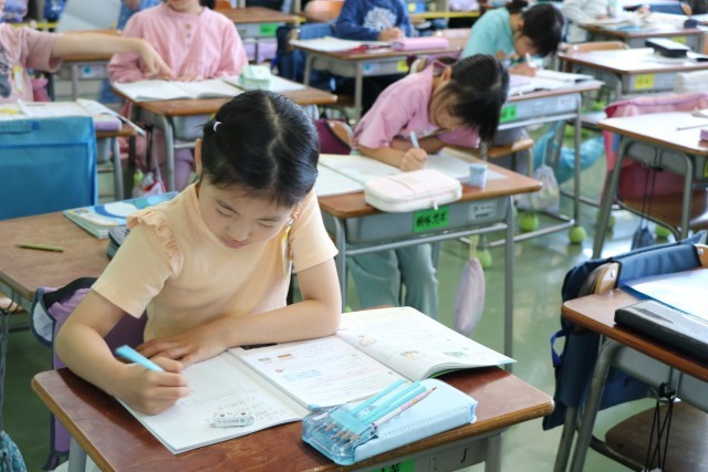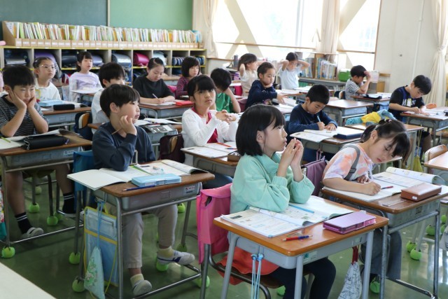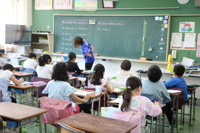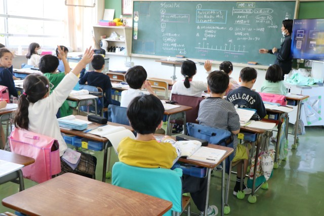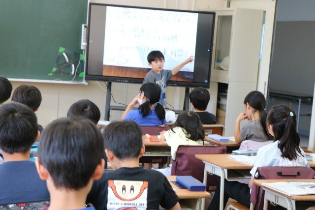砧小学校では3年生以上の算数の学習は、3クラスを4つに分けて学習を進めています。昨年度までランチルームだった教室が、今年度から算数少人数教室となりました。学習する内容は同じですが、それぞれのクラスで子どもたちに合ったやり方で学習を進めます。