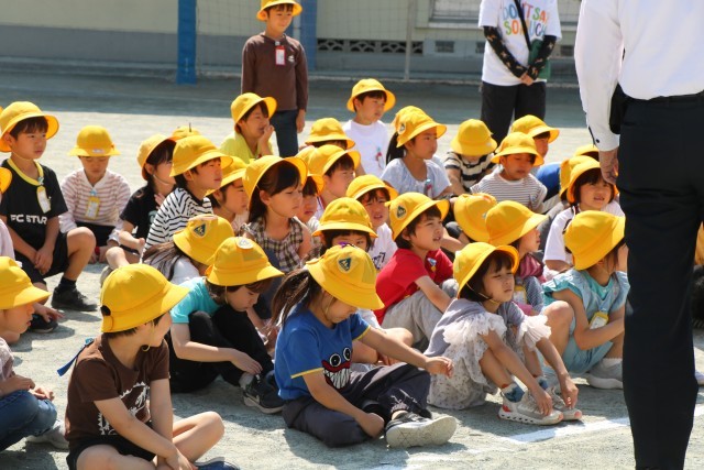 写真は交差点での待ち方の話を聞いているところです。車道にはみ出て待っている、携帯電話をしながらなので周りを見ていない・・・など