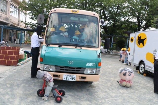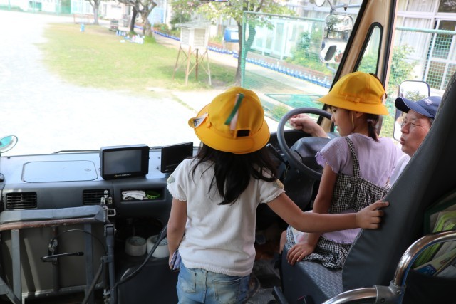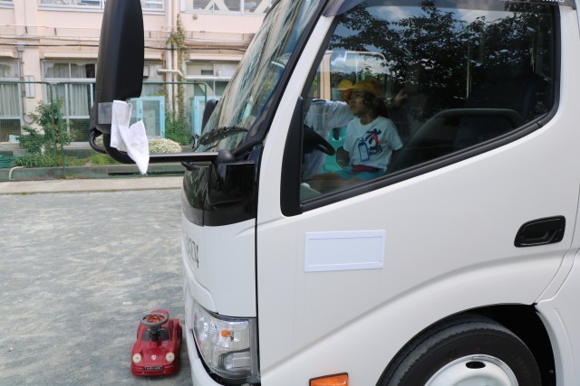 写真は運転席に座ると死角があってドライバーからは見えない場所があることを教えてもらっているところです。車のすぐ近くに立ったり、遊んでいることは危険だということがとってもよくわかりました。