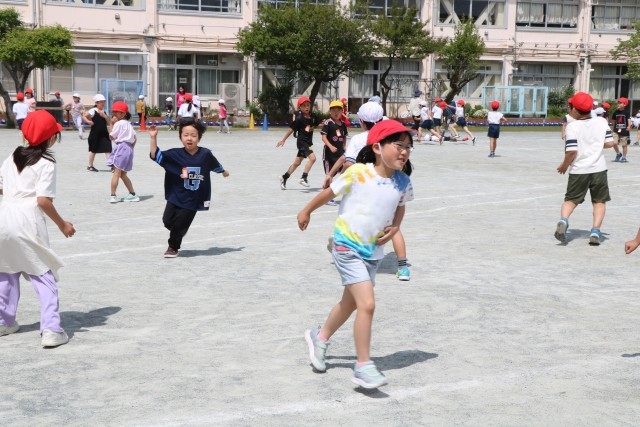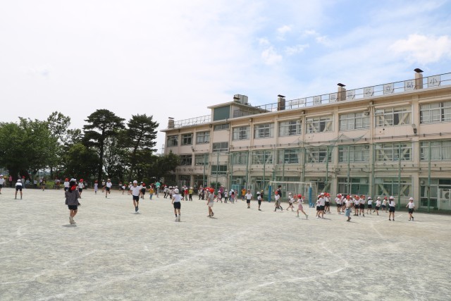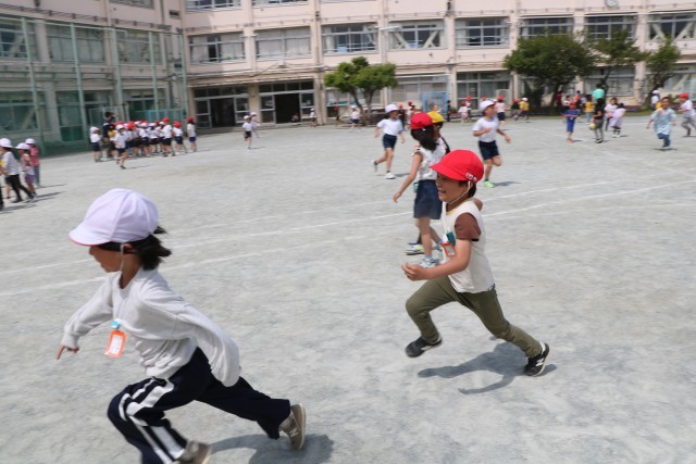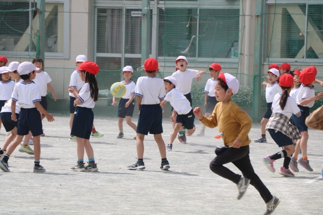 鬼ごっこをしたり、ドッジボールをする2・3年生の子たちも楽しそうです。鬼ごっこは逃げる、止まる、方向転換するといった動きを繰り返すことで、瞬発力やバランス感覚など運動能力全般が発達していきます。また、戦略的な考え方やチームワーク、協調性が育まれます。お互いの邪魔にならないように遊んだり、ぶつからないように走り回ったりすることが砧っ子は得意です。