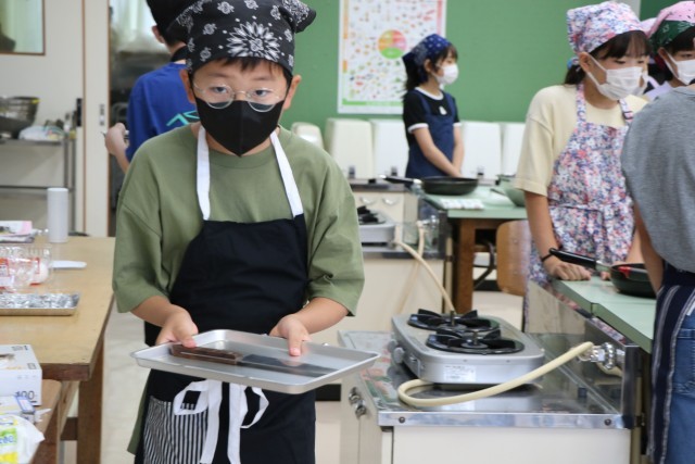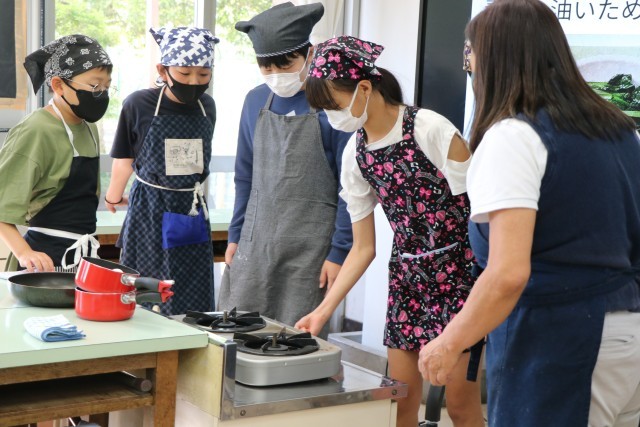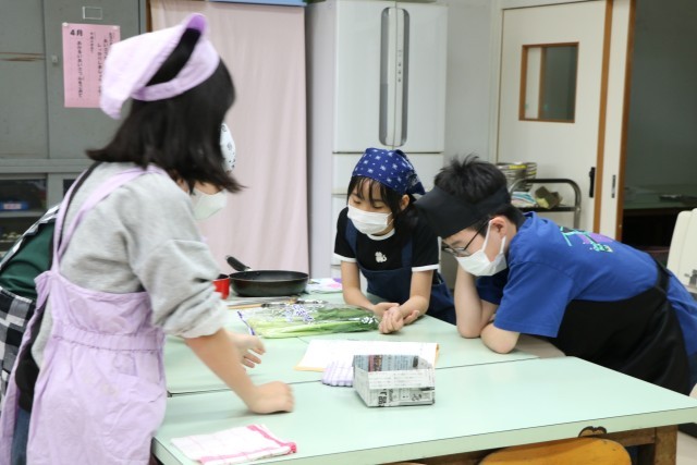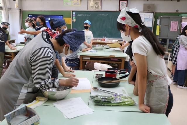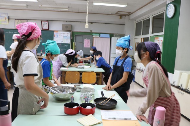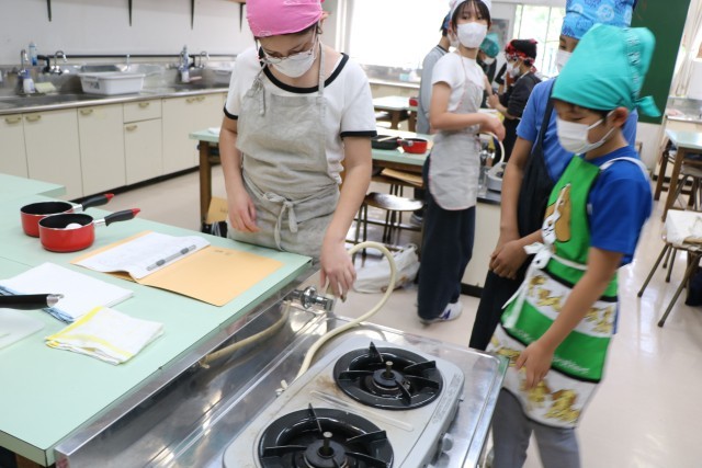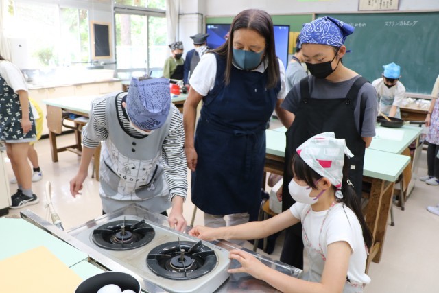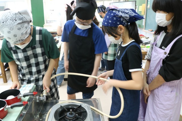 6年生家庭科小松菜の油いためとスクランブルエッグの調理実習の様子です。まず初めにガスコンロのセットの仕方、火のつけ方を復習して、今日の実習工程の復習確認を班ごとにしてから実習開始です。実習の内容がきちんと頭に入っていまが、ファイルにメモしたものを見ながら分担をしています。