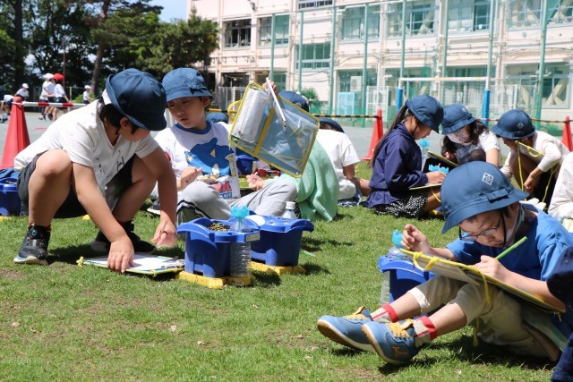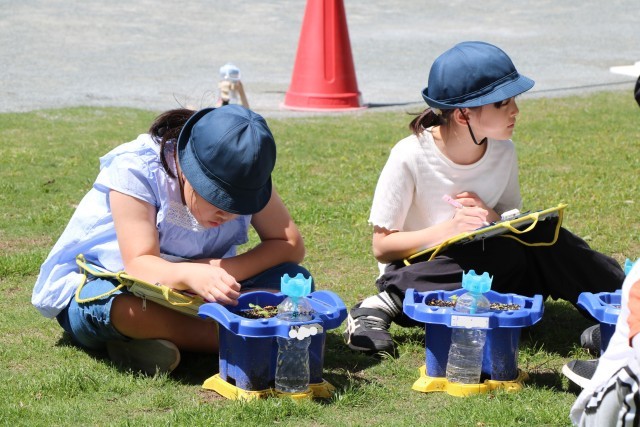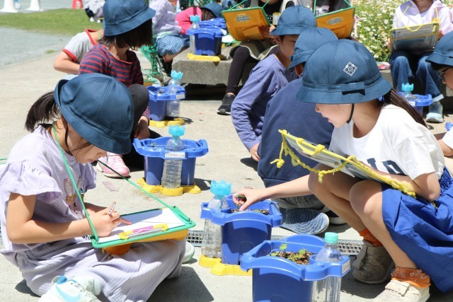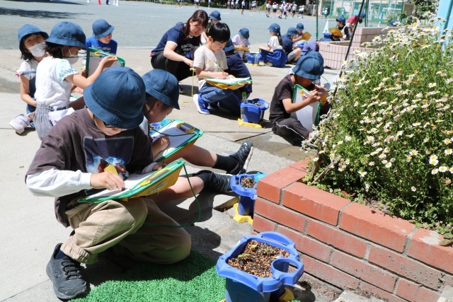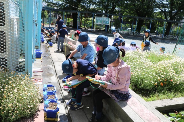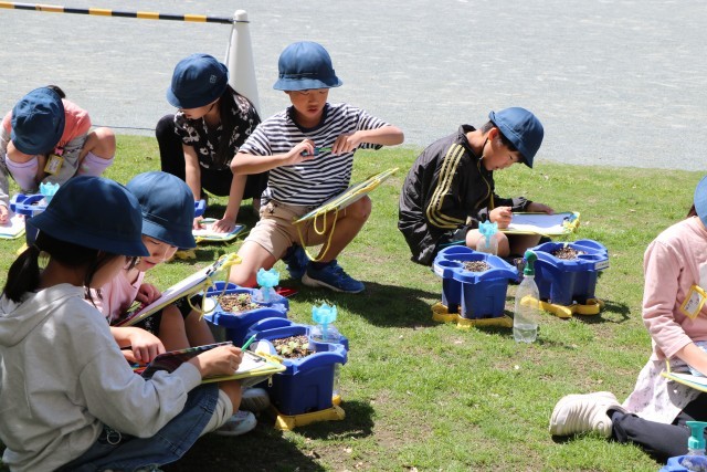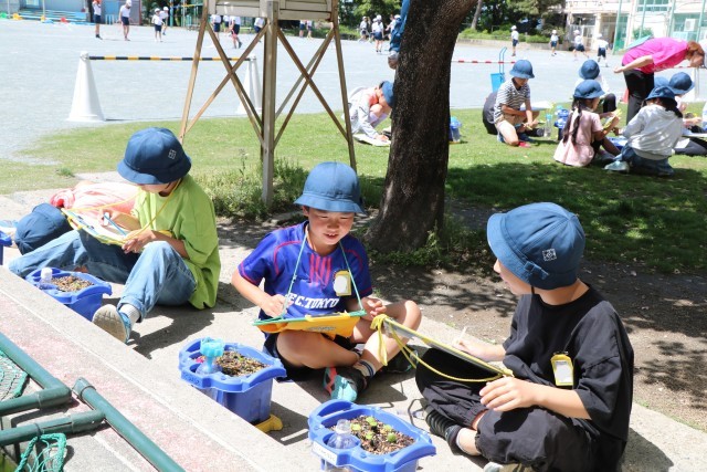 3年生理科の様子です。連休が明けたら、みんなの植木鉢にかわいい芽が出ていました!ホウセンカの芽です。よーく観察しながら観察カードを描いていました。日差しが暖かな気持ちの良い時間でした。