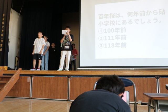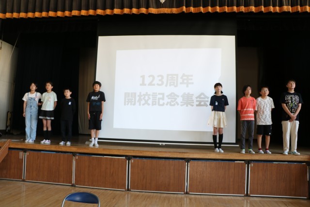 今日は砧小学校の開校記念日です。体育館に全校児童が集まり、開校記念集会がありました。集会委員会が今日の日のために、校章の意味、開校当時の砧小学校の様子、百年桜のことなど砧小の歴史を調べ紹介しました。紹介の中にいくつかクイズもあり、みんなで楽しく開校記念をお祝いしました。