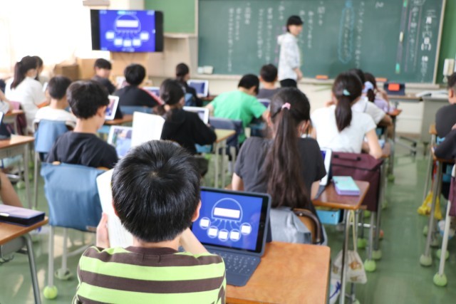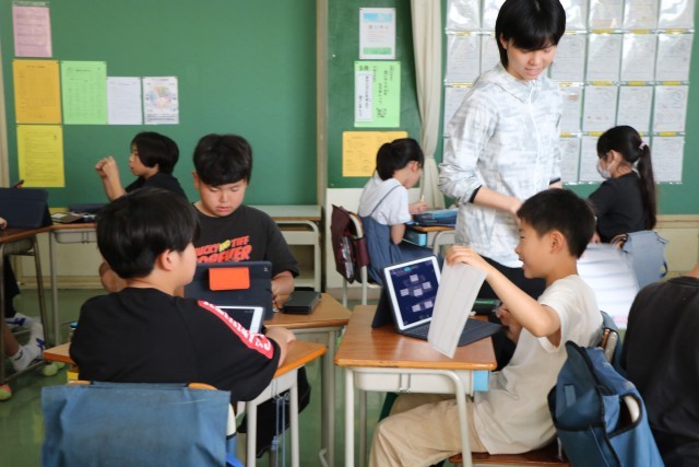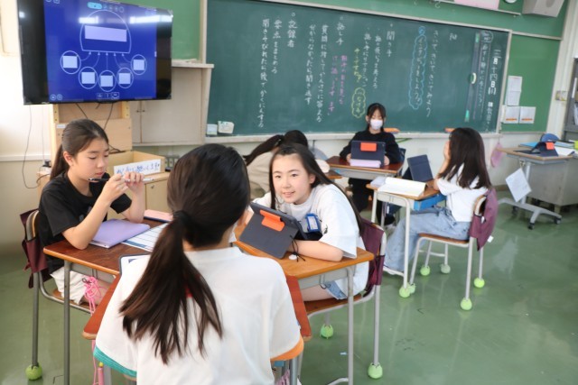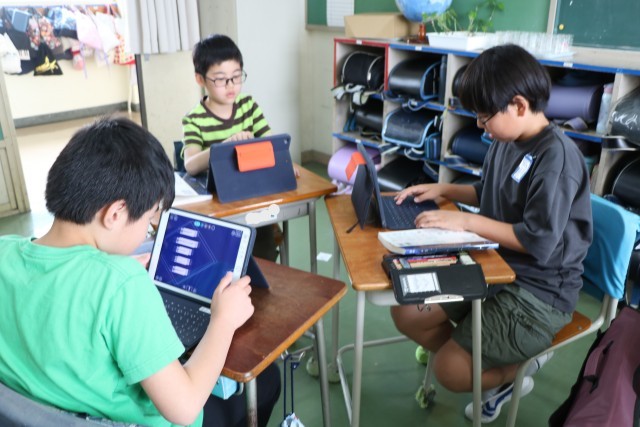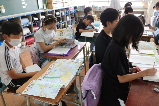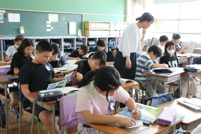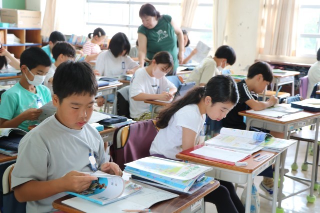 5年生の学習の様子です。社会では地図帳を見て、緯度と経度の違い、地図の色の違いなど気が付いたことを基に自分で予想を立てています。国語では、「きいて、きいて、きいてみよう」では、友達の魅力を引き出すという目的で「聞き手」「話し手」「記録者」の3人一組でインタビューを行います。話の展開に沿った質問や、答え方を学びます。