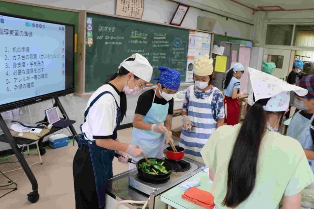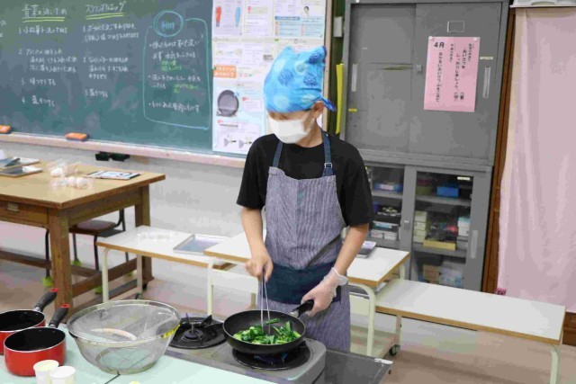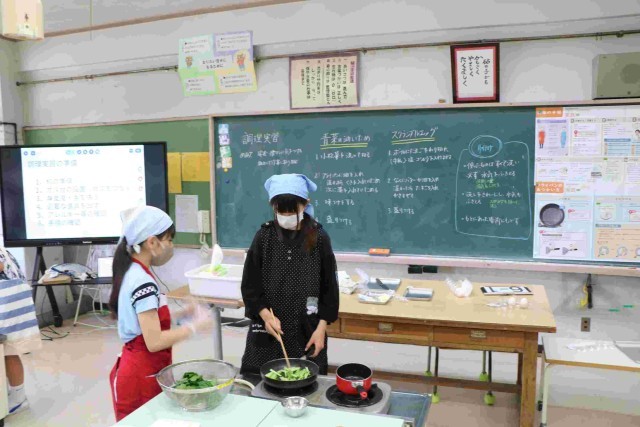 6年生は、調理実習も2年目で、慣れてきているようです。小松菜を炒める手つきが自然になってきました。家でも作ってくれるといいですね。