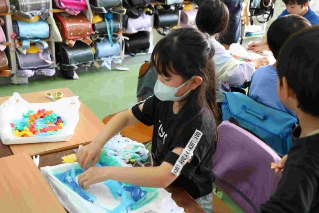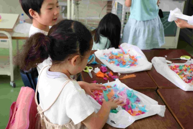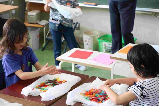 2年生の図工の様子です。お花紙を5色重ねて切って並べて、どんな模様ができるかやってみました。