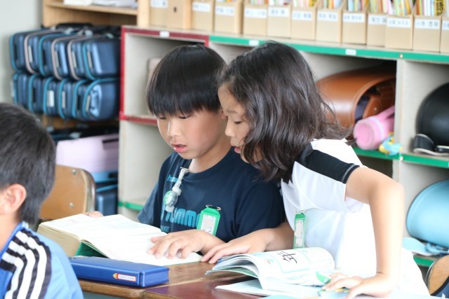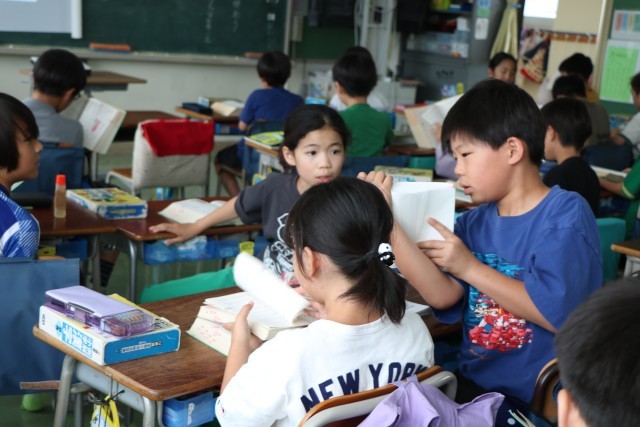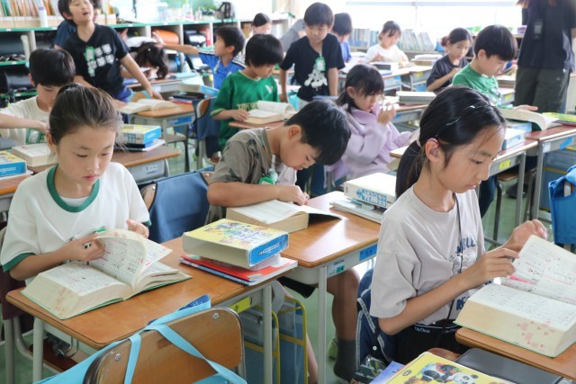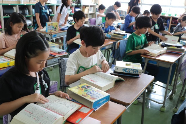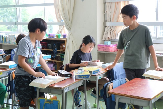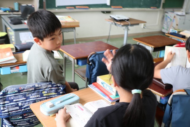 4年生の国語、今日は漢字辞典の使い方についてです。漢字辞典を使い部首索引を使ったり、総画索引を使ったり、いろいろな使い方があることを知ります。「僕はそう各索引の方が調べやすい」「私は音訓索引」「でも読み方がわからないときはどうすればいい?あ!部首索引で調べる」・・・・のように、自分たちで気が付いていきます。先生が、近くの友達と相談して・・・と言うと、すぐに相談ができるのは、みんなが同じ学習にきちんと向いているからこそです。そして友達同士仲が良いからです。学習へのモチベーションがさらに上がる学級です。