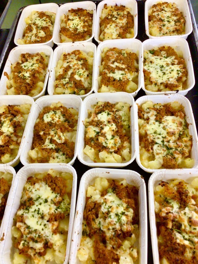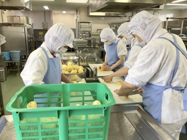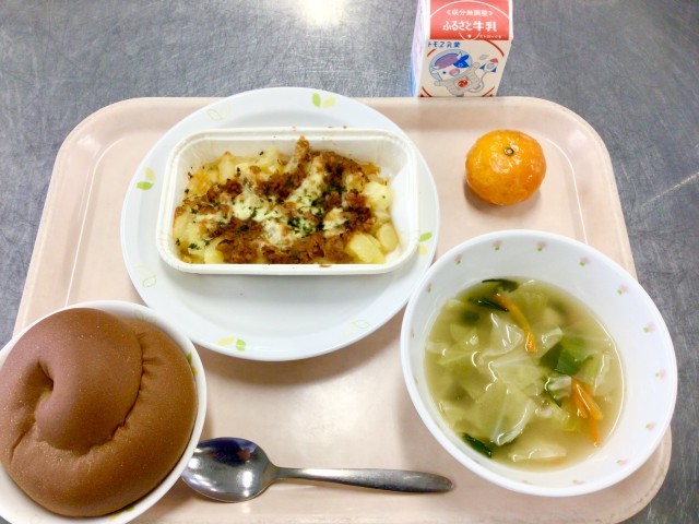今日の給食は長崎県産の新じゃがいもを使ったポテトグラタンです。じゃがいもの皮を剥いて、1cm角に切って、蒸して、ミートソースを作ってチーズをのせて、オーブンで焼いて・・・とたくさんの手間はかかりますが、熱々のおいしいポテトグラタンができました。