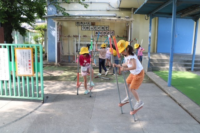 朝遊びの様子です。最近2年生の竹馬挑戦がよく見られます。補助が付いている竹馬からこつこつ練習しているので、ぐんぐん上手になっていきます。