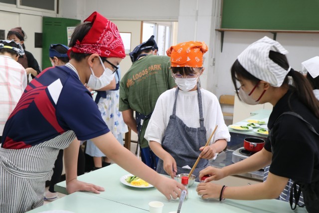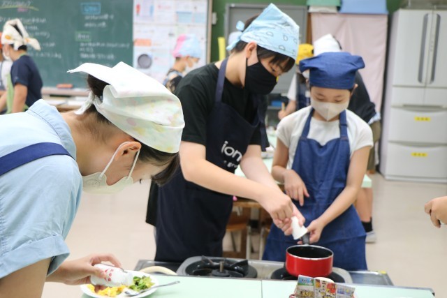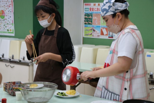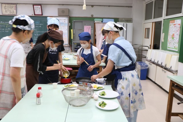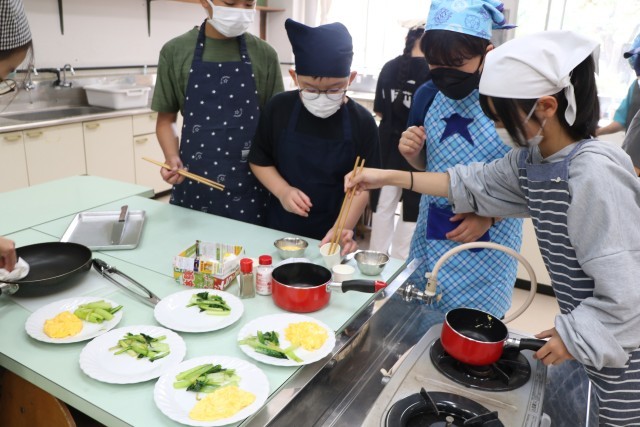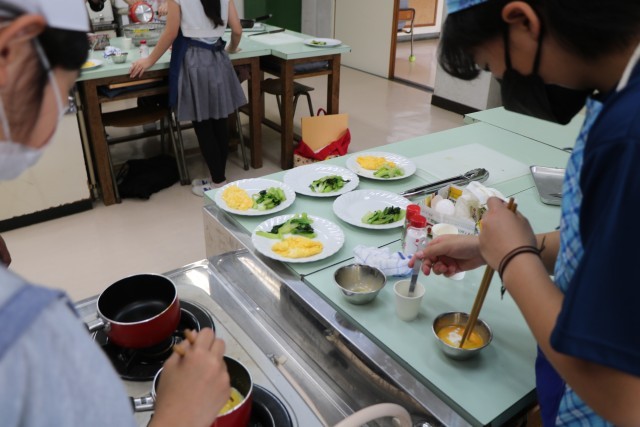 6年生家庭科・調理実習の様子です。「いろどり野菜の油いため」の実習の前の、小松菜の油いため、スクランブルエッグの調理実習の様子です。2品をなるべく同時に出来上がるように、そして片付けをしてより気持ちのいい状態で試食できるように、とっても課題が多い中班の仲間と協力して一生懸命頑張っています。