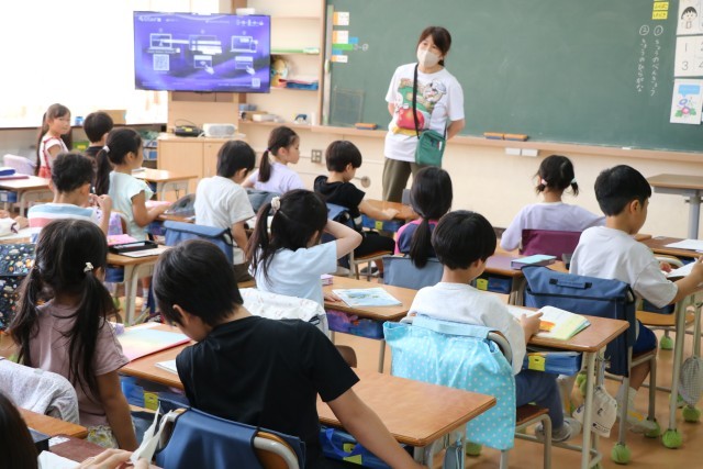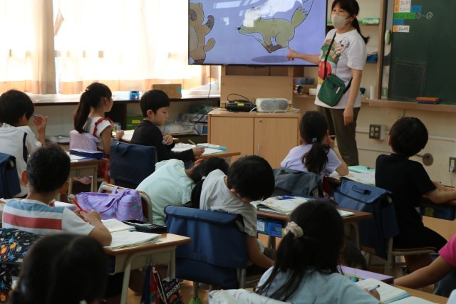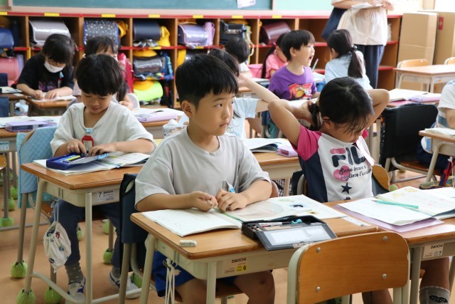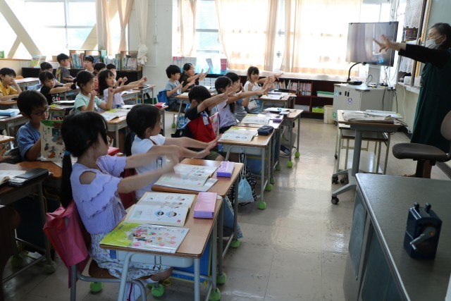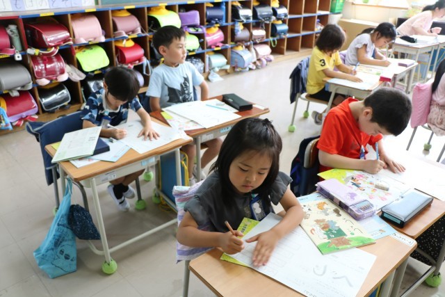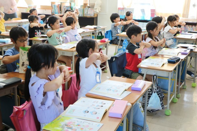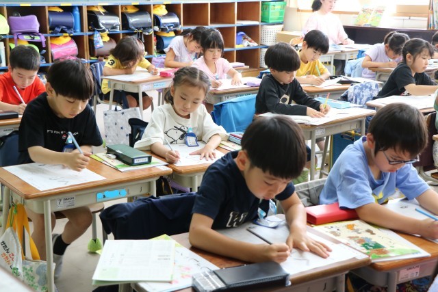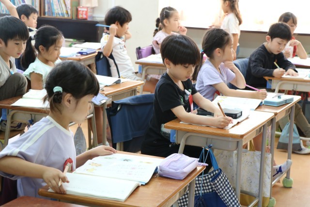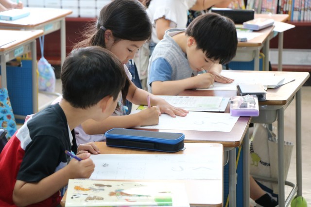 1年生書写は、指や腕の体操、良い姿勢をみんなで確認してから始めます。一生懸命取り組んでいます。