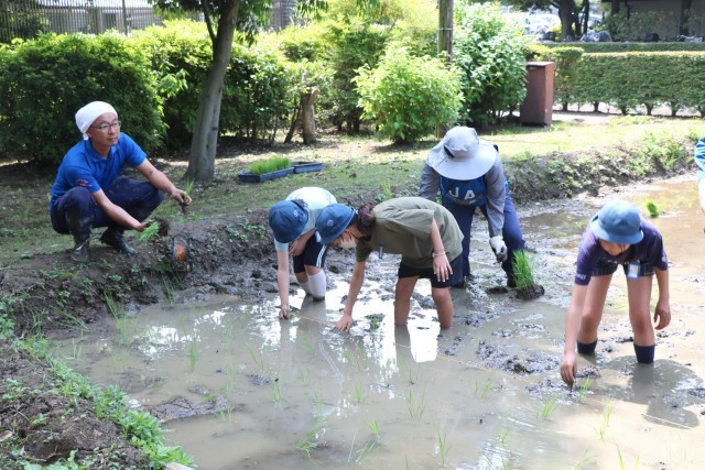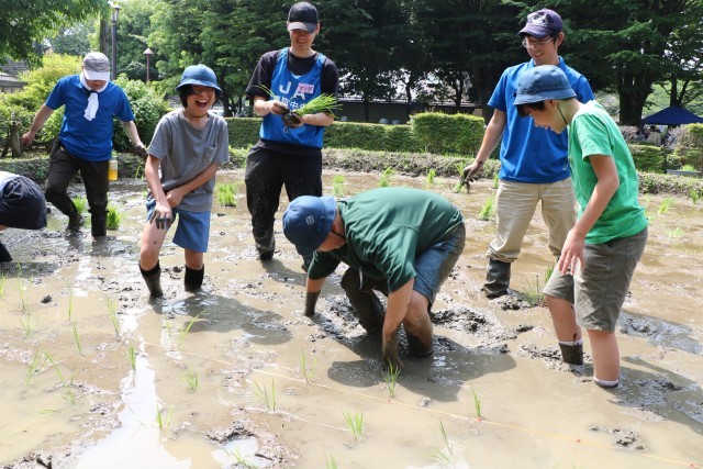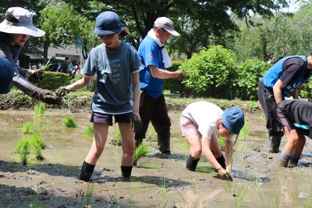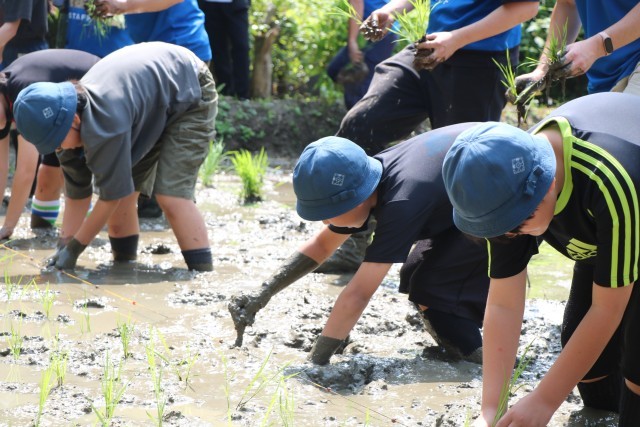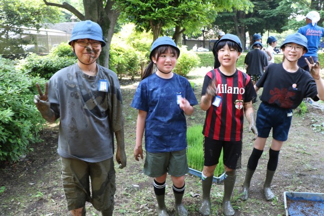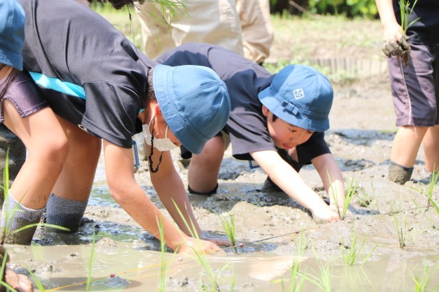 まずは、5年生だけで田植えをします。その後、保育園の田植えや後片付けを手伝いに行く子、幼稚園と一緒に田んぼに入り田植えをする子に分かれます。