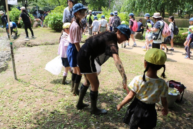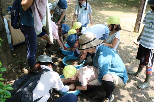 田んぼの中はもちろん、外で待っているときや、終わった後の泥だらけ手足の後始末まで、年長さんのことをとっても大切に思い、お世話にしてくれる5年生でした。帰りに、公園や広場で一緒に遊んで、お別れをしました。