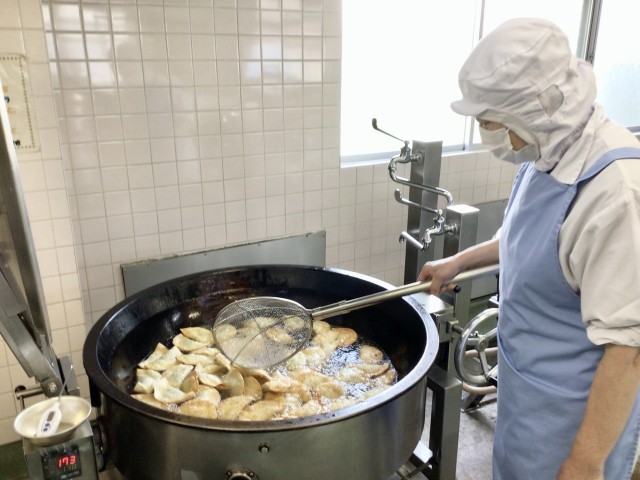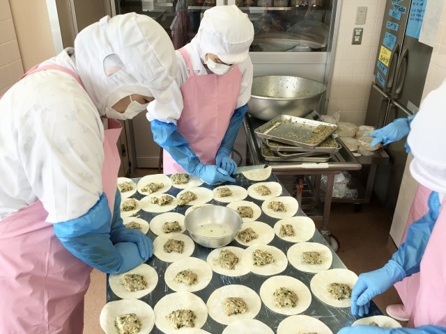 今日の給食は、人気No.1のジャンボ餃子です。約600個手作りしました。