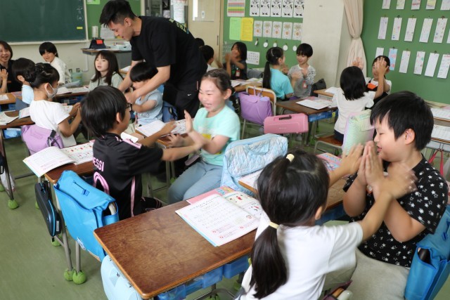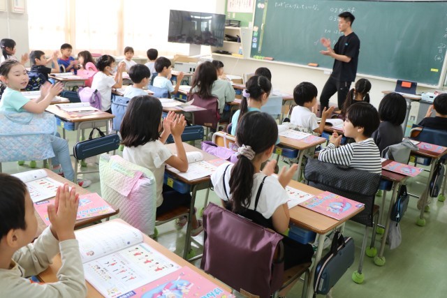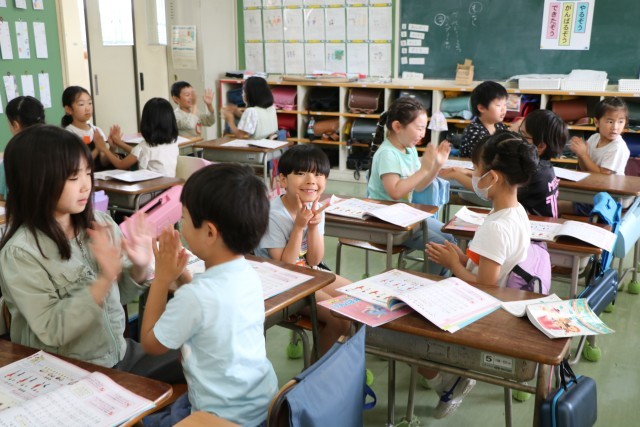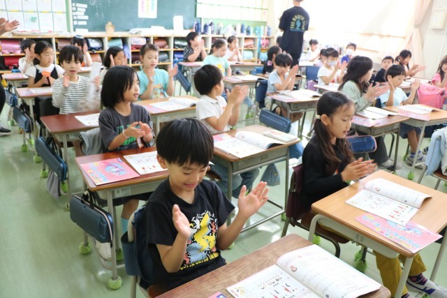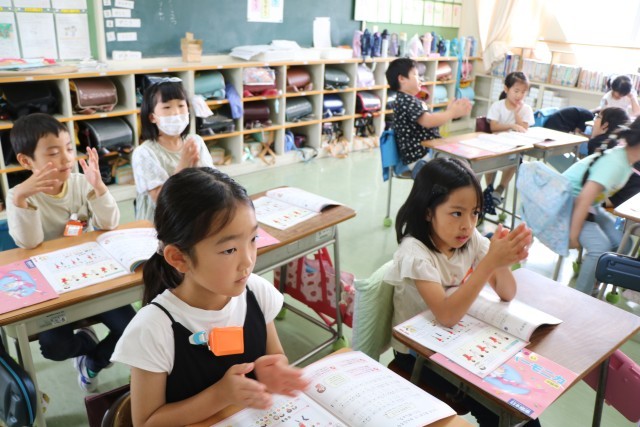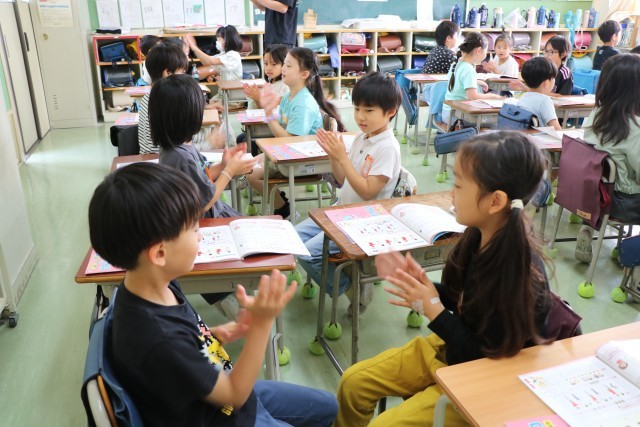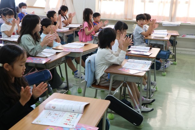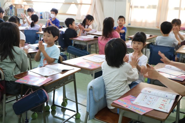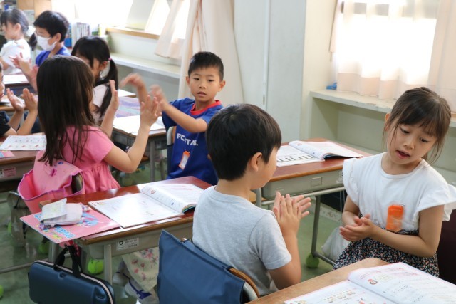 2年生音楽の様子です。歌に合わせて手でリズムうちをします。同じ曲で2拍子も3拍子もあり、体でリズムの違いを感じ味わうことが大切です。