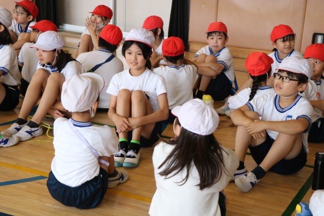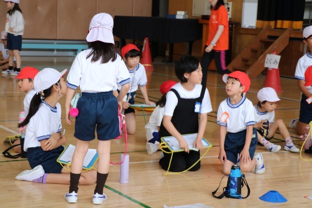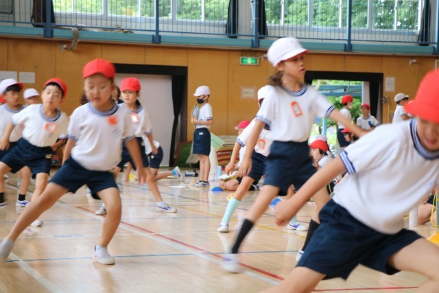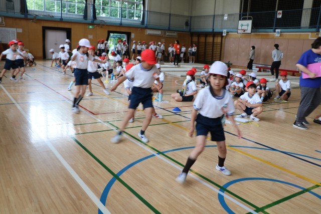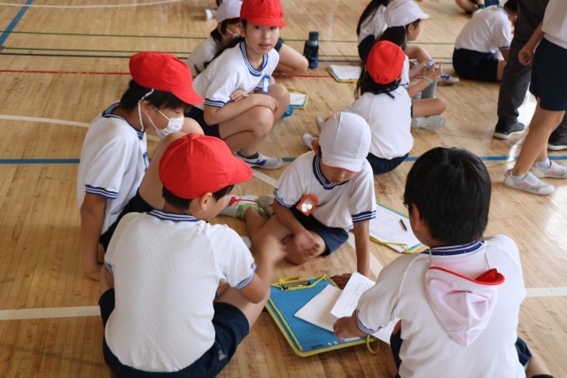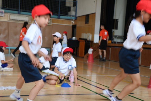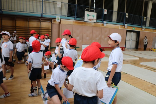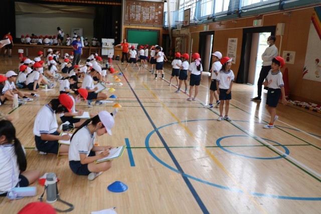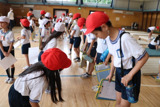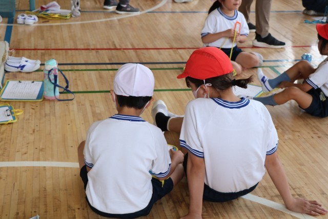 1・6年生が終わったら、6年生だけが測定し、次に2・5年生の順番になり、終わったら5年生だけが測定します。写真は2・5年生の様子です。ちょっとした待ち時間の間にもやり方を一緒に確認したり、どうするといい記録につながるかアドバイスしたりする様子が見られました。