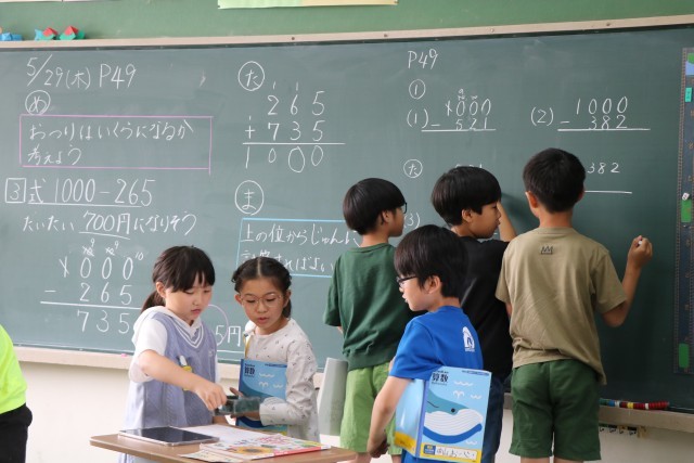 3年生算数「たし算とひき算のひっ算を考えよう」の学習、今日ア1000から引くひっ算のやり方の学習です。練習問題をみんなで確認しながらやったり、練習問題に取り組んだり、友達の作ったひっ算に挑戦したり、どのクラスも真剣に頑張っていました。