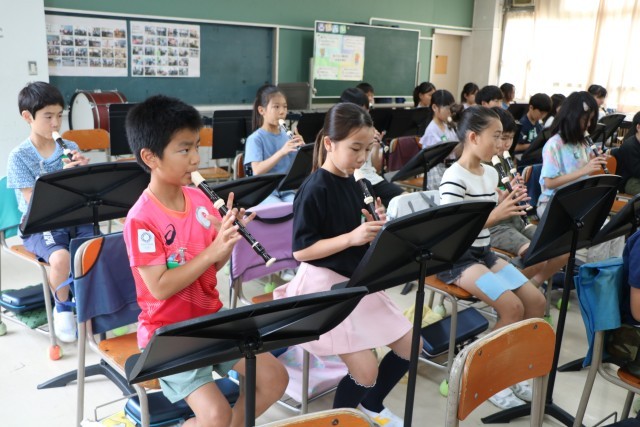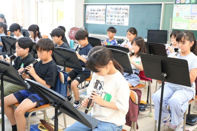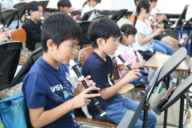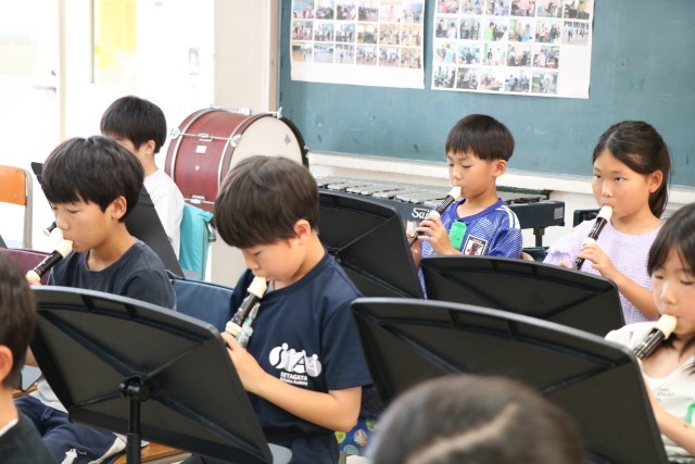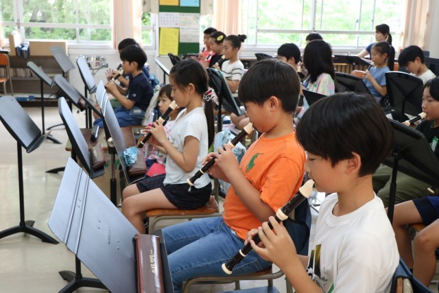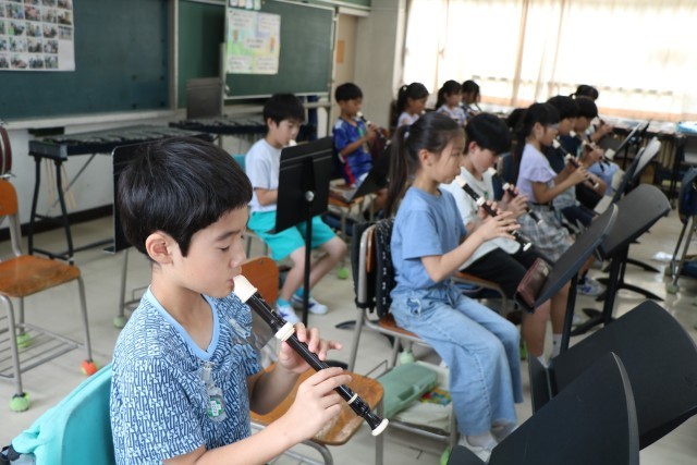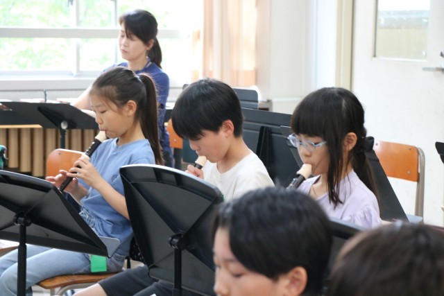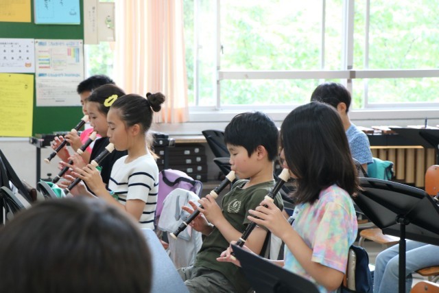 4年生音楽の様子です。ちょうど音楽室に入ったとき、石井戸囃子のリコーダーを演奏していました。音楽の時間に短い時間でも演奏しているので、指遣いや音程がしっかり安定しています。