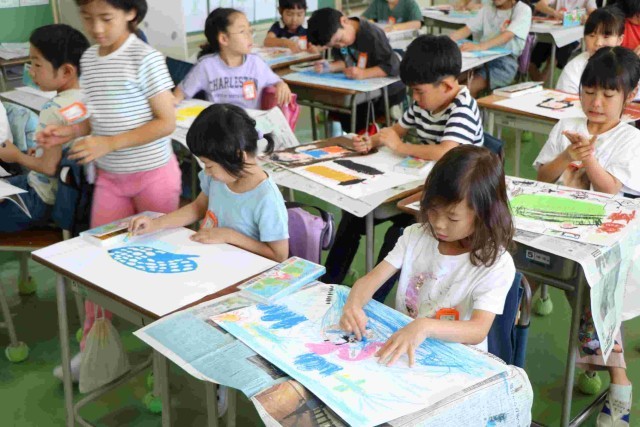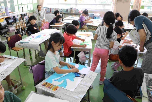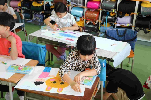 動物さんと一緒にいる私の絵を描いています。大きく描いて、しっかり塗り込めるようになっています。