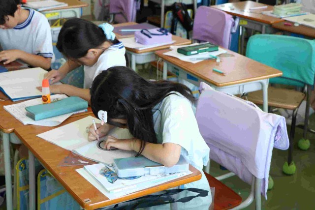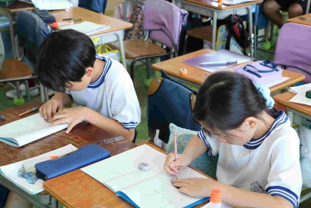 分度器を使って角度を測ったり、指定された角度の角を書いたりする学習が始まっています。細かい目盛りを見て正確に作図するのは、もしかしたら計算より難しいかもしれません。ですが、先生に見てもらってOKをもらえた時の喜びも、計算の答えが合っていた時以上かもしれません。