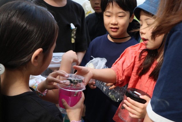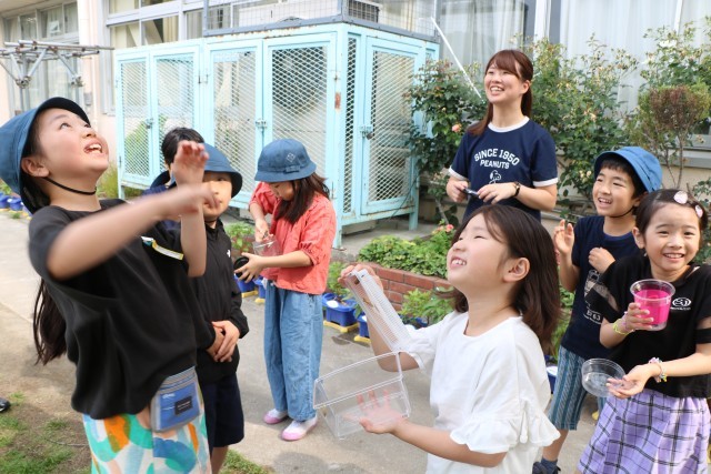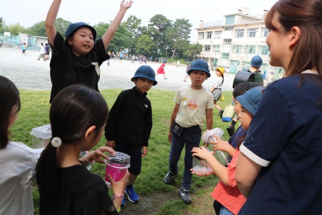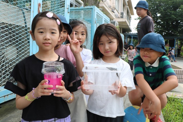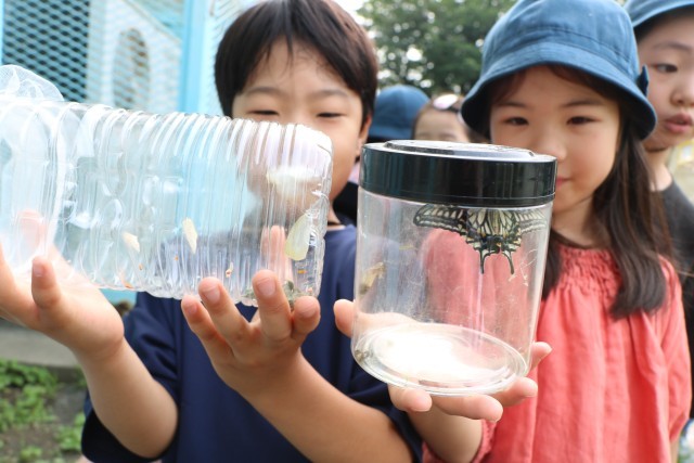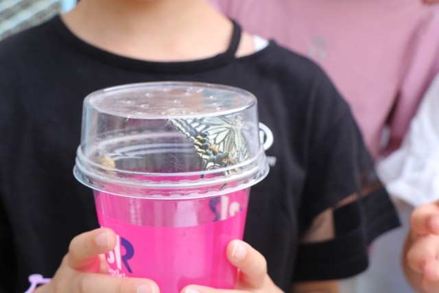 そしていよいよ狭い入れ物の中から飛び立ちます。ガーゼのふたを取ってもなかなか飛び立ちませんでしたが、そのうち子どもたちの大歓声に見送られてひらひらと花のある方へ飛んでいきました。