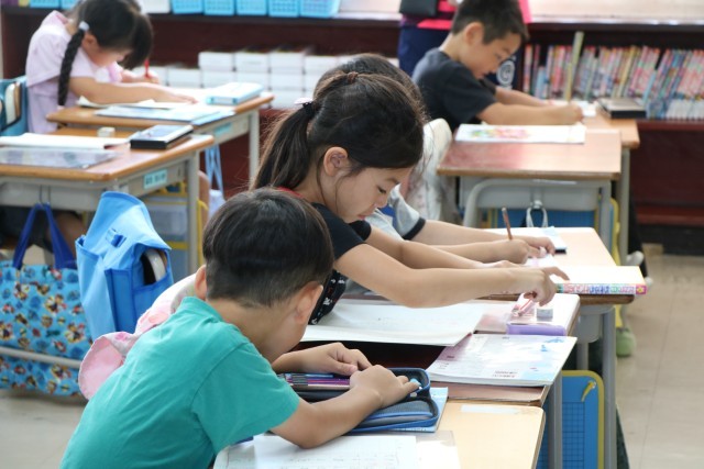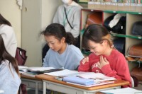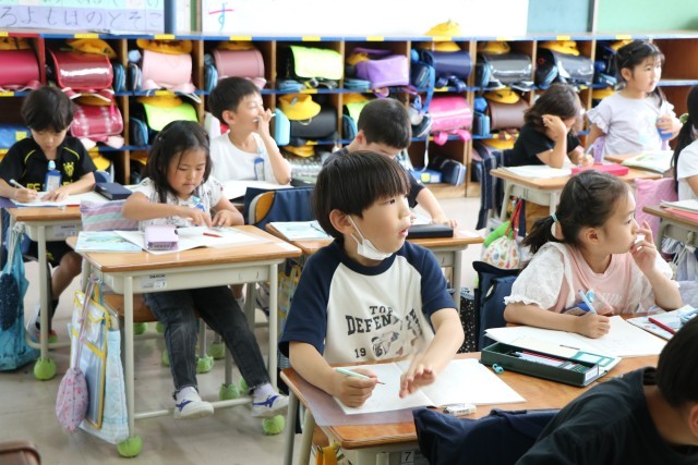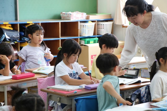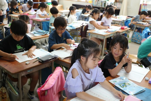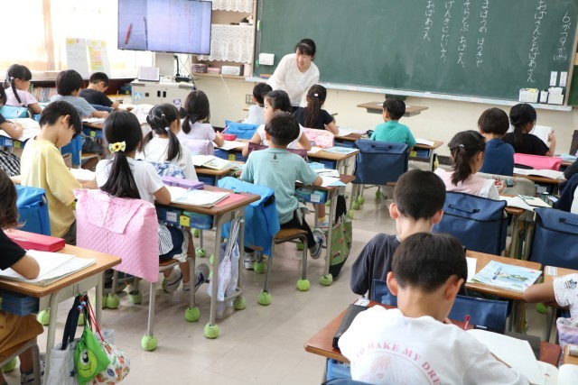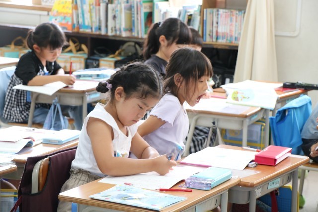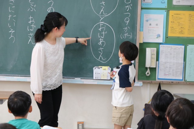 1年生国語「おばさんとおばあさん」の学習です。ノートに今日の学習のめあてを書いて学習が始まります。ノートを正しく使うことも、今後どの教科でも何年生になっても大切になる基礎です。担任の先生が丁寧に一人ひとりのノートを確認しています。