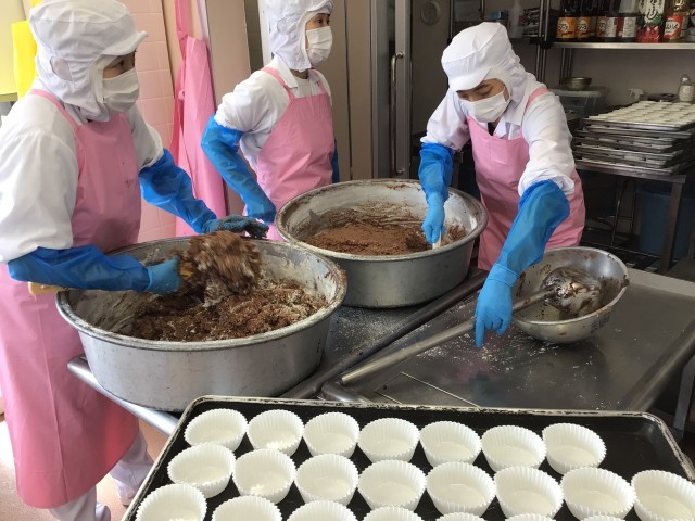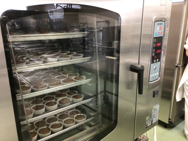 おからマフィンはおからの入ったココアマフィンです。美味しくおからの栄養がとれるデザートです。給食室の大きなオーブンで作りました。
