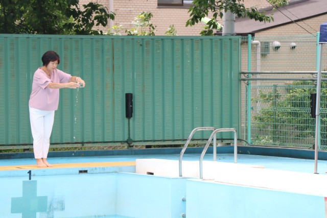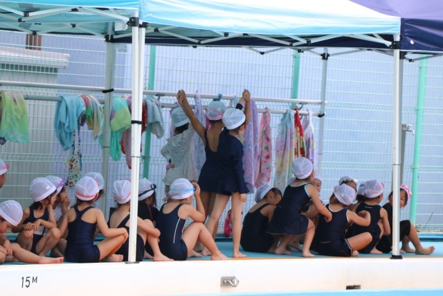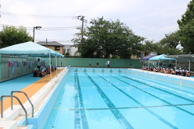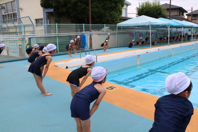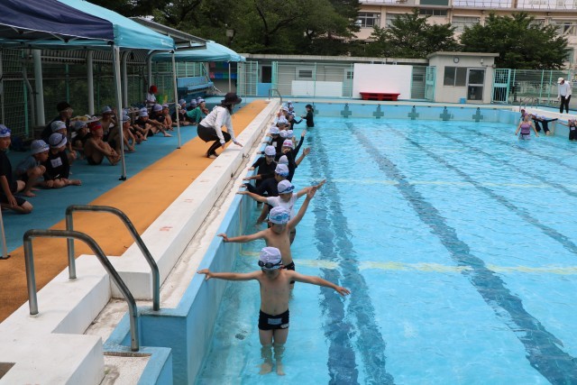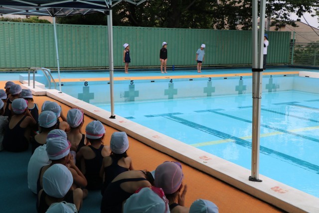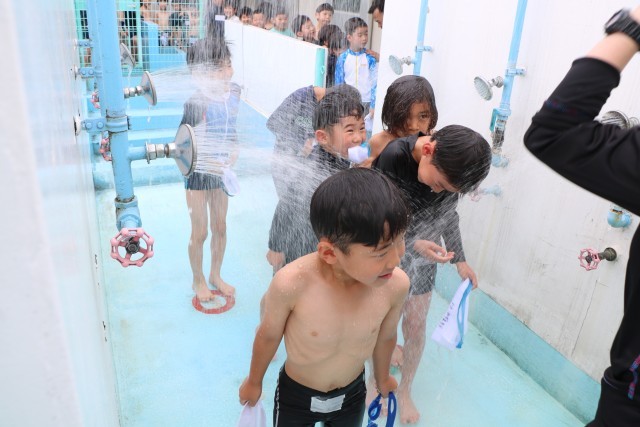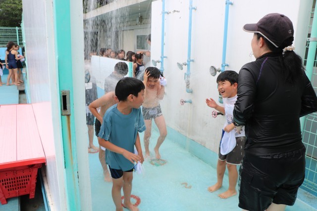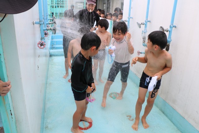 1年生水泳学習の様子です。はじめにプール開きをしました。お神酒でみんなの安全を願い、楽しく怪我無く水泳学習ができるようにプールと約束しました。児童代表の言葉も自分の頑張りたいことがはっきり述べられていて立派でした。今日はシャワーも気持ちよさそうです。