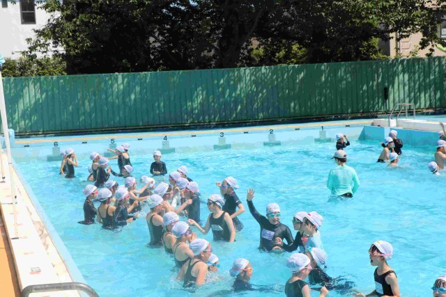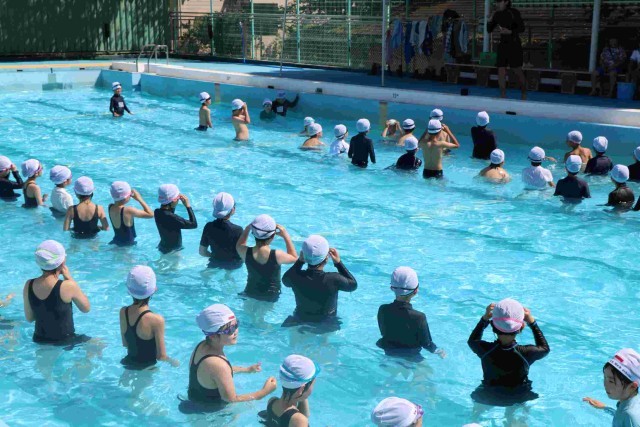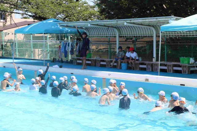 プールサイドはテントで日陰が多く、プールの水は暑さのおかげで冷たがることもなく、気持ちよく授業ができていました。