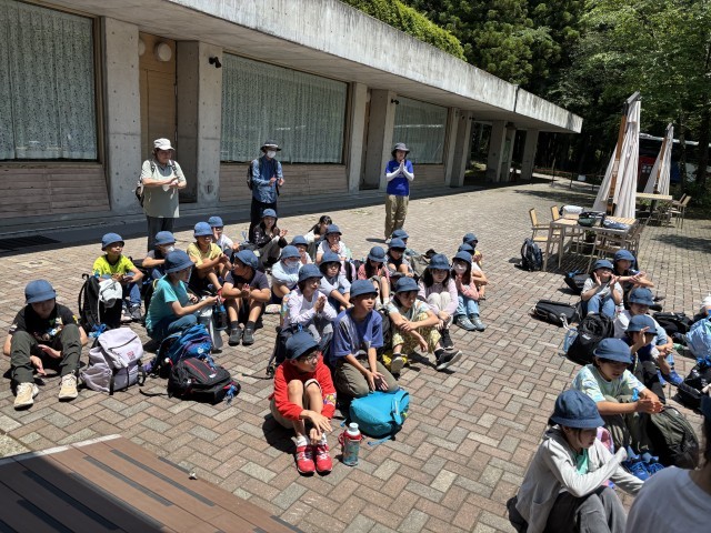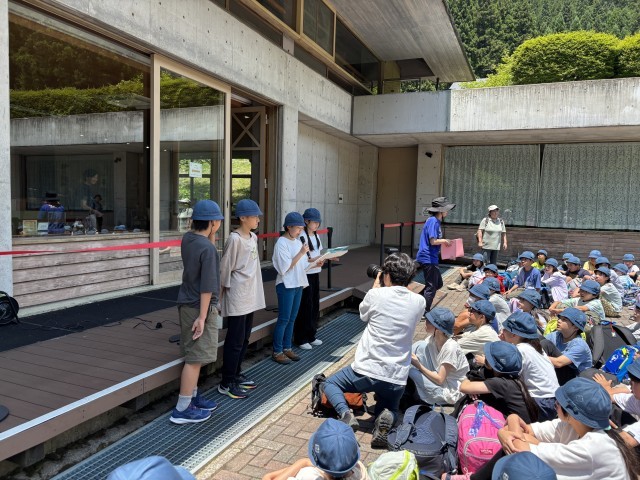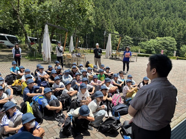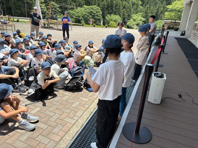 ふじやまビレジに到着しました。緑に囲まれて涼しい風が吹いています。開室式を行いました。開室式の態度もとても立派でした。