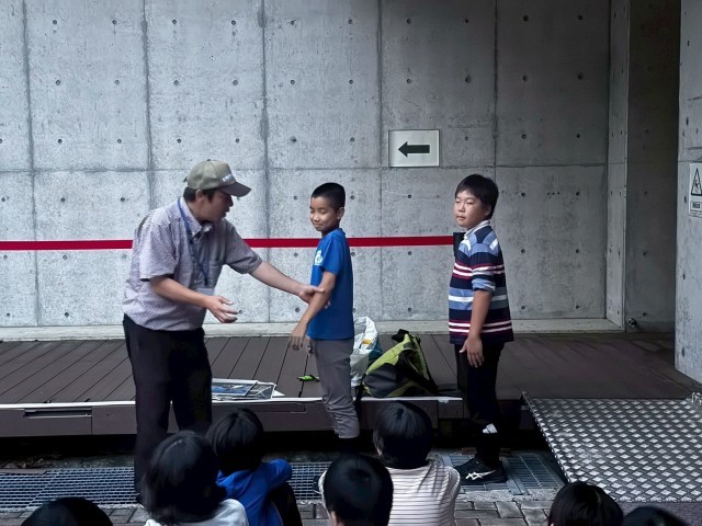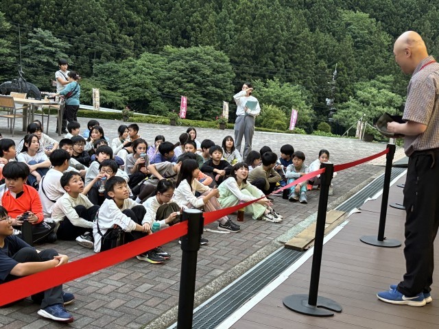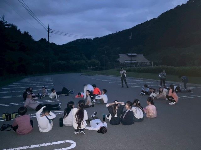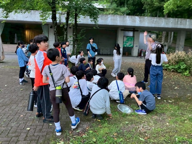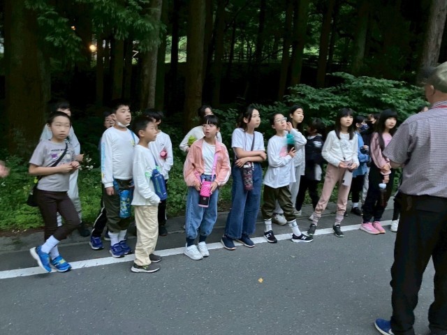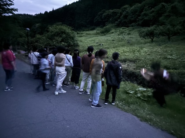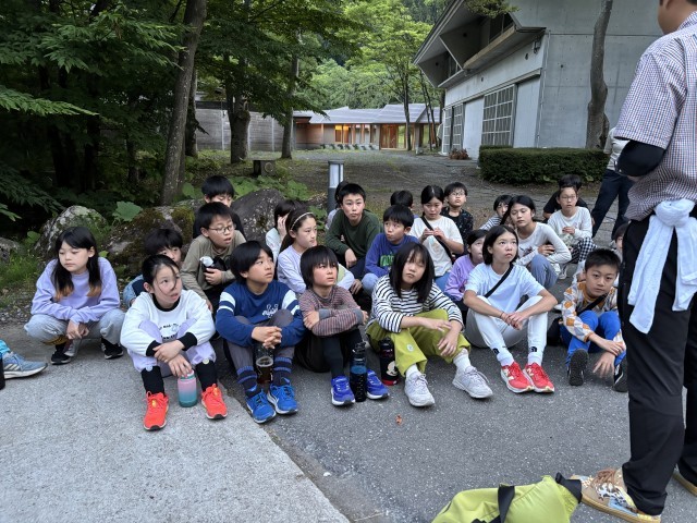夕食後はナイトウォークに行きました。クラスごとにガイドさんについていただき、暮れかかる時間からのんびり歩いて観察するコースです。昼間同じところを歩いた時には感じないものまで感じたり、聞こえなかったものまで聞こえたり、五感を研ぎ澄ませて川場の大自然を感じてきました。森の奥には鹿見えました。目が光っていて、なんとも可愛らしい佇まいでした。