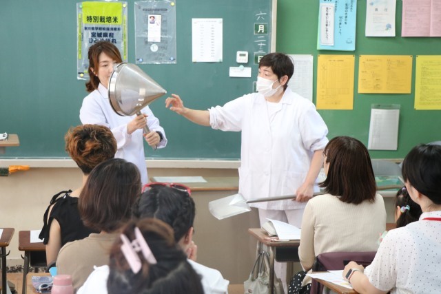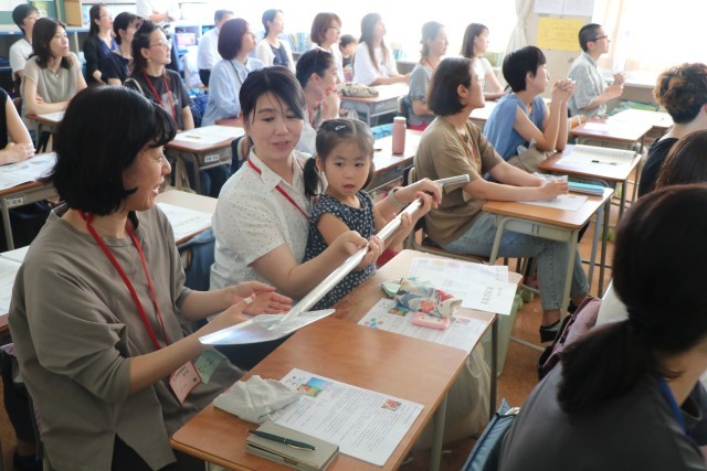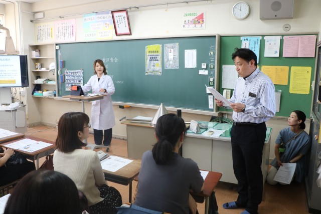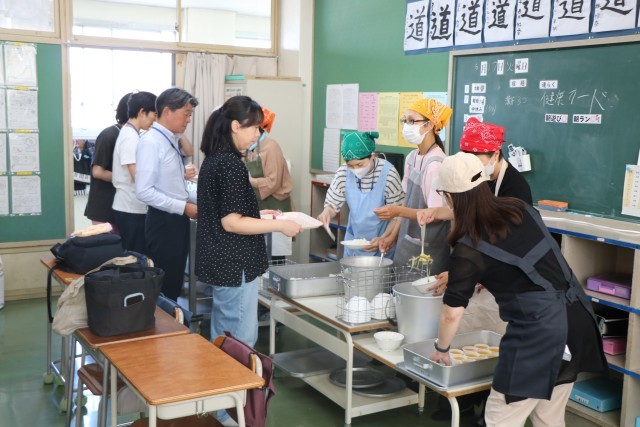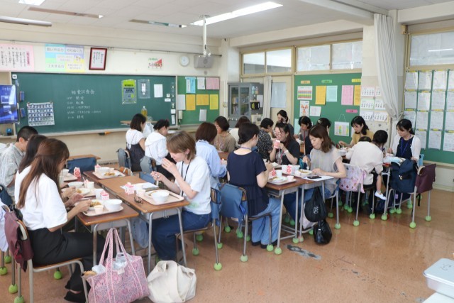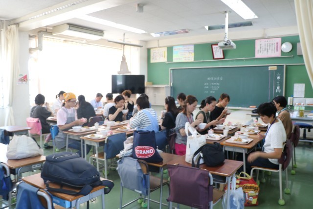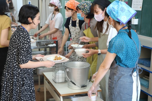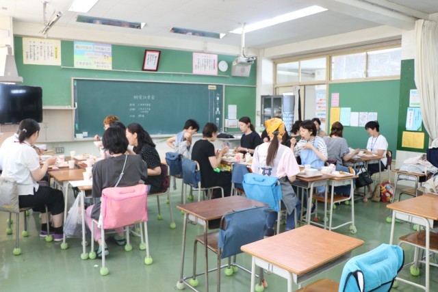 最後に、給食試食会の様子です。今年度の試食会のメニューは、子どもたちにも大人気の「夏野菜の豚キムチ丼」です。小学校の辛さはどの程度なのか?どのようにして配膳するのか?保護者の皆様もとっても興味のあるところです。給食調理さんにも来ていただき、給食調理のお話を聞いたり普段のご家庭での食についての悩みや疑問点などを質疑応答したり、充実した時間を過ごせたそうです。試食会実施に当たっては、担当の方々の綿密な打ち合わせ、準備のおかげで楽しく滞りなく実施できました。
