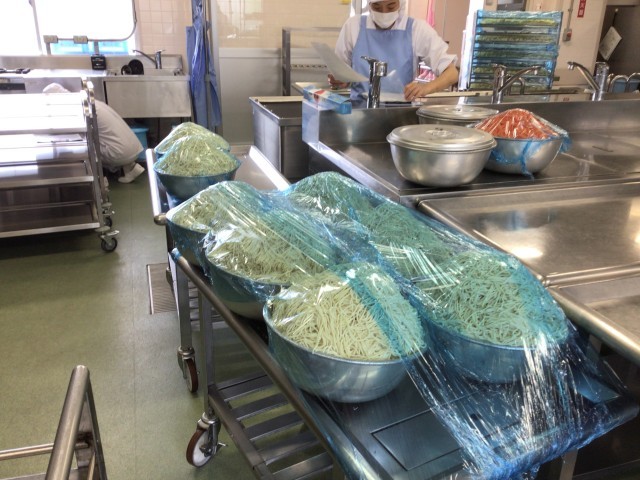 今日は夏の献立「冷やし中華」です。給食の冷やし中華はつゆも鰹節から手作りしています。麺は生中華麺を茹でてから水にとり、冷やしています。暑い時にぴったりの献立です。じゃがいものバター焼きも子供たちからとても好評でした。