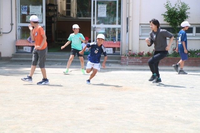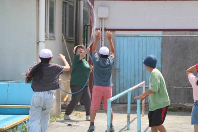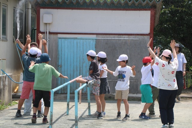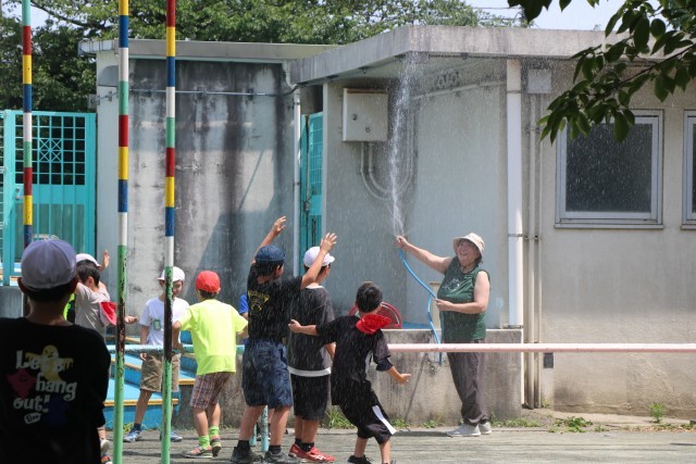 夢の国のアトラクションかのように、何分間おきにミスとシャワーをやってくれる先生のところに涼みに来ては、また遊びに行く子どもたちです。