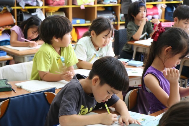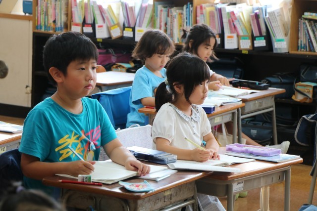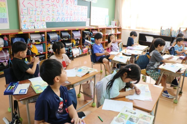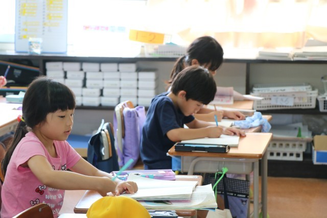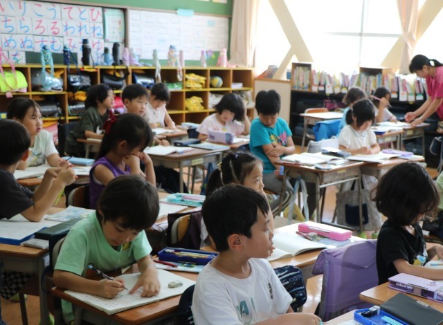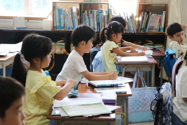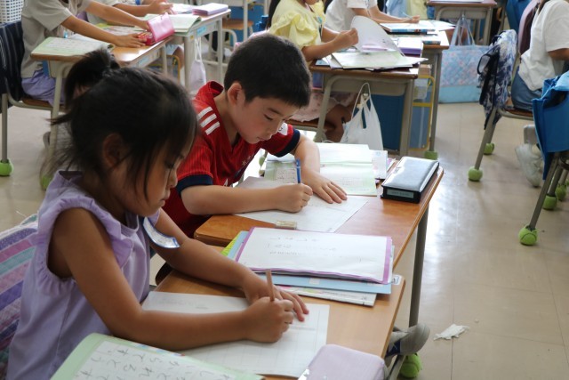 1年生は3クラスとも国語・書写の学習の様子です。姿勢よく!と気をつけながらも、集中するとどんどん前傾姿勢になってくる子どもたちがかわいいです。