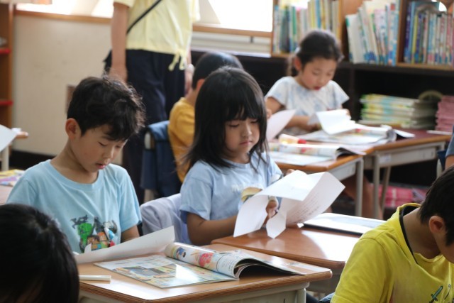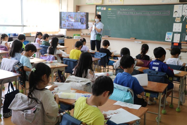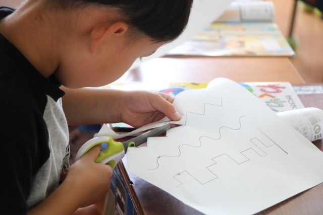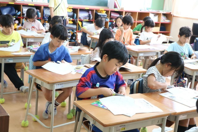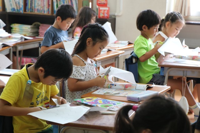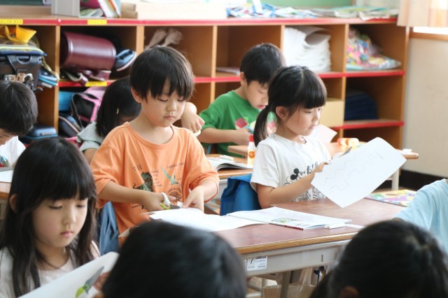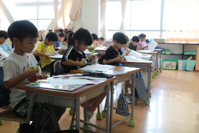 1年生図工「ちょっきんぱでかざろう」の様子です。紙の折り方や切り方を工夫して飾りを作ります。まずは安全なはさみの使い方を確認し、練習からです。みんな集中して取り組んでいます。