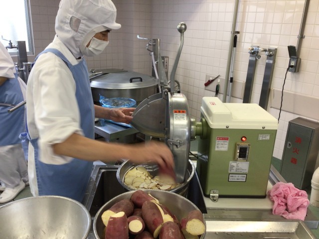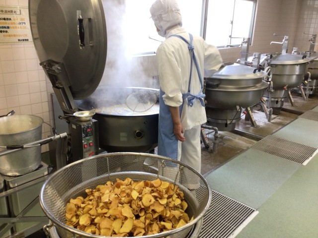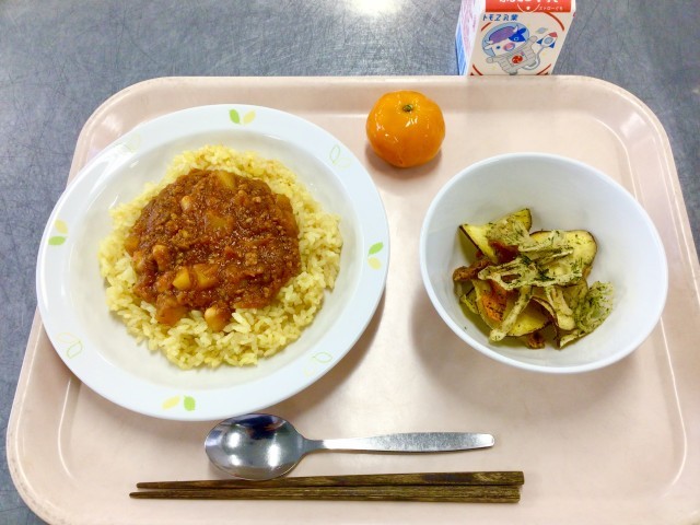 野菜チップスはさつまいも、れんこん、ごぼう、にんじんを薄く切った後、油で揚げて作りました。仕上げに青のりと塩をまぶしています。チリビーンズライスも野菜チップスも子供たちに人気のある献立です。