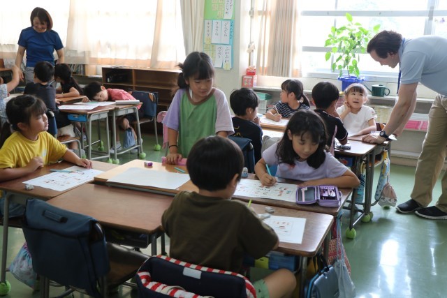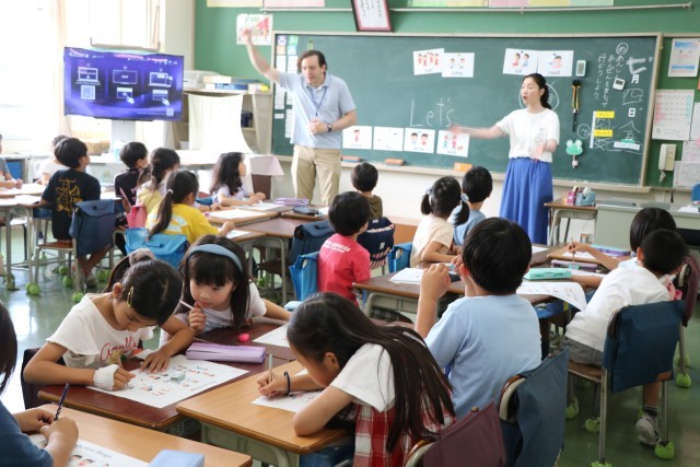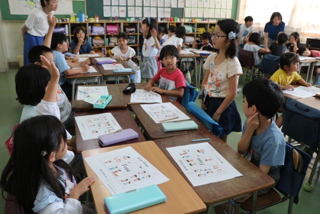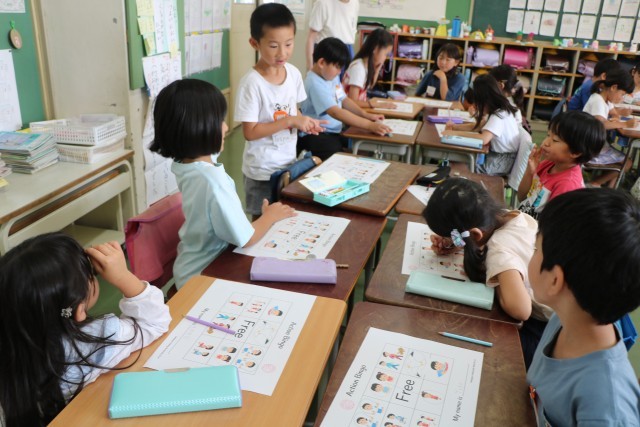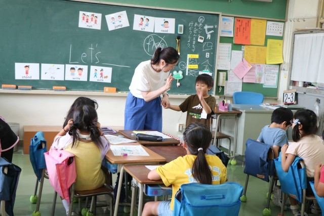 2年生外国語活動の様子です。動作の言い方を学習したので、グループになってジェスチャーゲームをします。グループの中の一人がジェスチャーをしたら、残りのグループのみんなであてっこします。もちろん英語で言います。