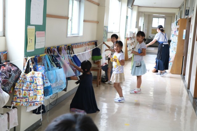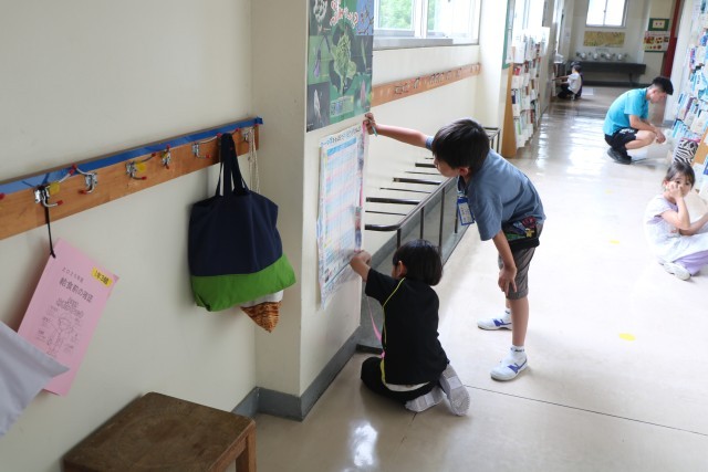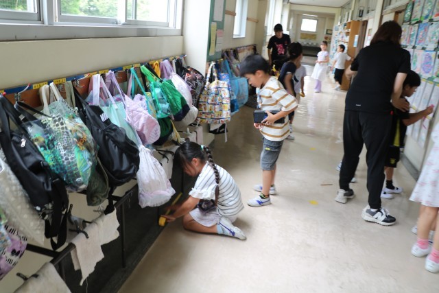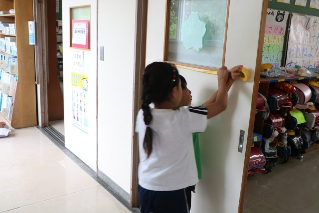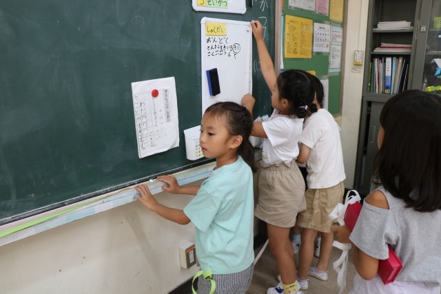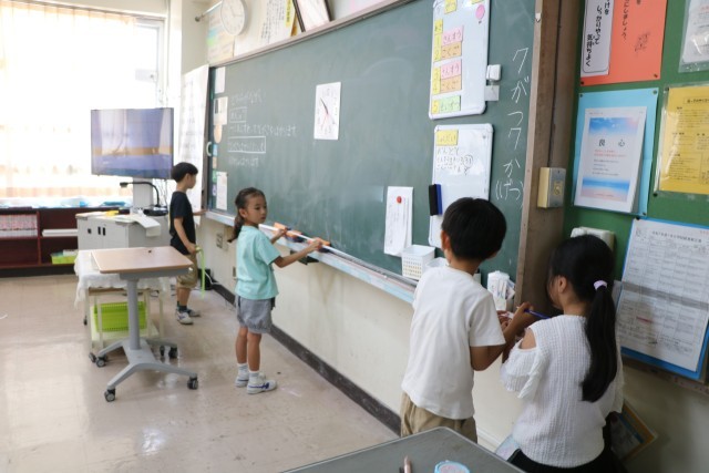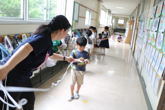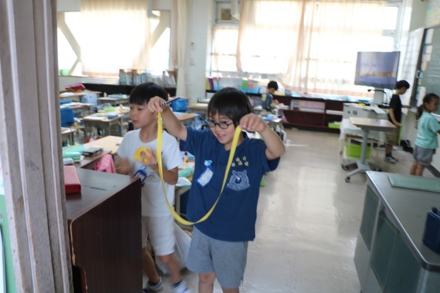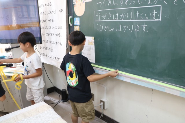 1年生算数「どちらがながい」の様子です。友達や先生と一緒に紙テープを使っていろいろな場所の長さを図っています。「この場所がこのくらいの長さだから、こっちはもっと長いと思うよ。」「そのかわりこっちなら短いと思うよ」などあちらこちらを予想を立てながら測っています。